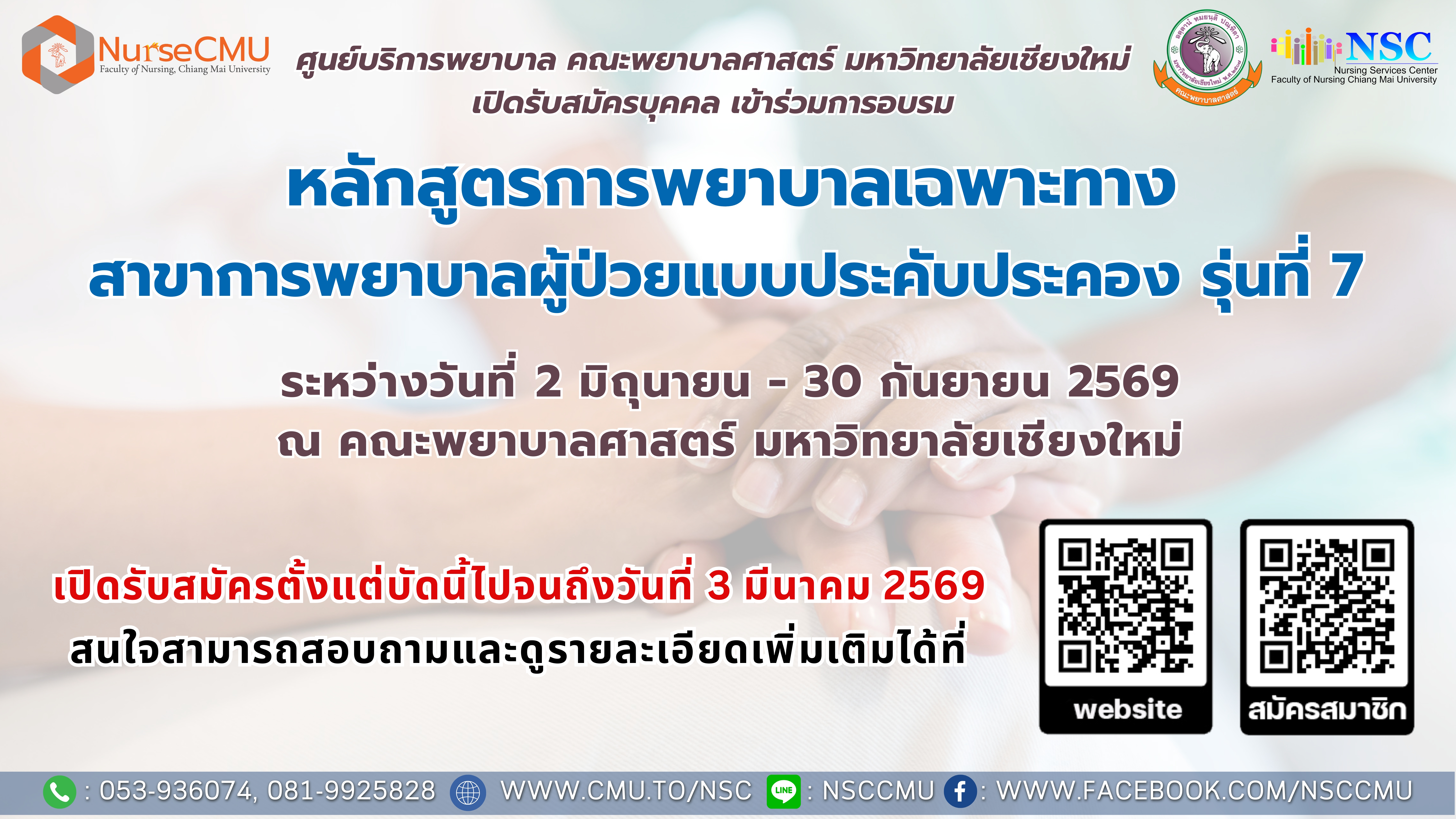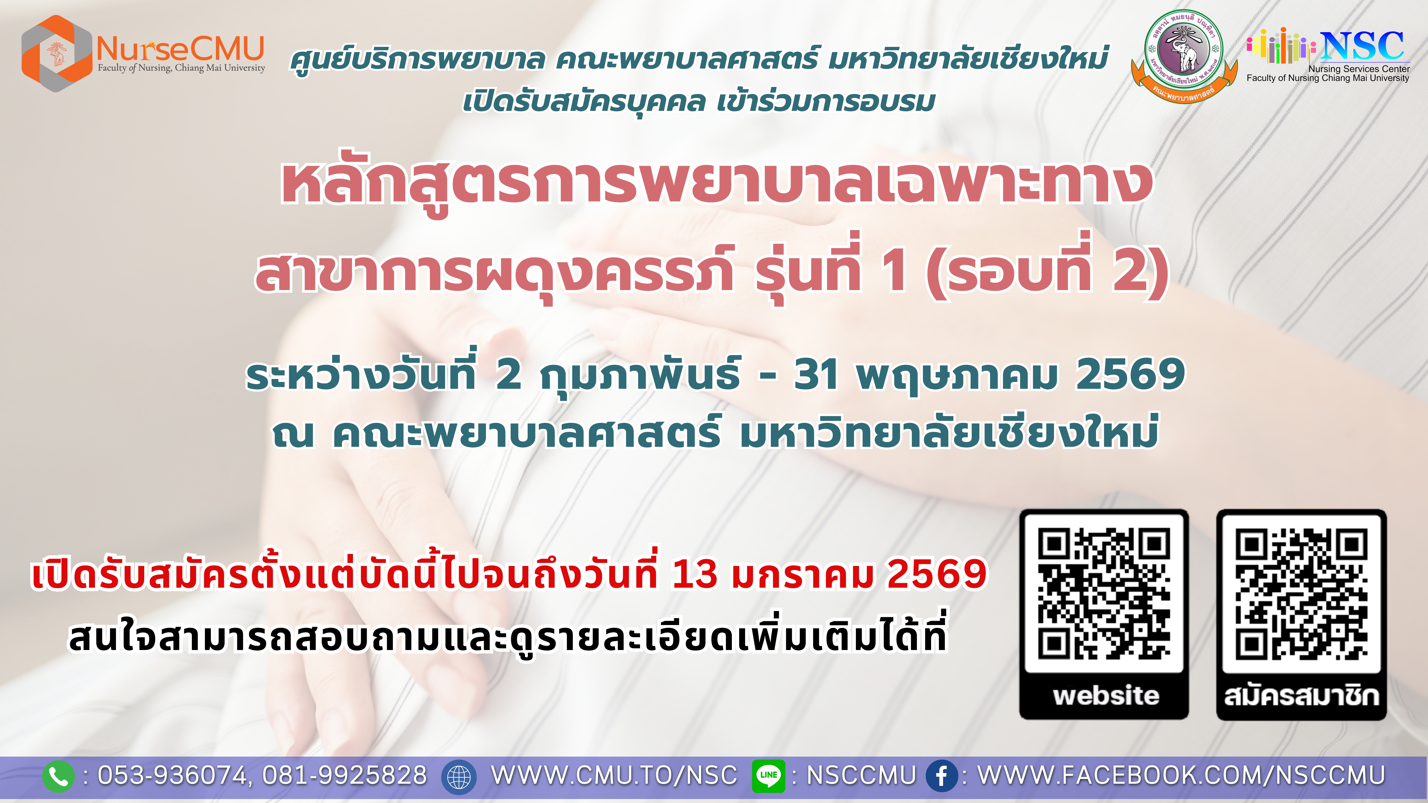 อบรมการพยาบาลเฉพาะทางหลักการและเหตุผล การผดุงครรภ์เป็นศาสตร์และศิลป์ในการดูแลสตรีและครอบครัวแบบองค์รวมอย่างต่อเนื่องทั้งในระยะก่อนตั้งครรภ์ ระยะตั้งครรภ์ ระยะคลอด ระยะหลังคลอดและทารกแรกเกิด ในภาวะปกติ ภาวะเสี่ยง และภาวะฉุกเฉิน ให้มีสุขภาพดี มีความผาสุก โดยบูรณาการศาสตร์ทางการผดุงครรภ์ ศาสตร์อื่น ๆ ที่เกี่ยวข้อง การใช้หลักฐานเชิงประจักษ์ ภูมิปัญญาท้องถิ่น และความหลากหลายทางวัฒนธรรมมาใช้ในการดูแล เป้าหมายสำคัญของการดูแลสุขภาพมารดาคือ การส่งเสริมความสามารถในการดูแลตนเองของมารดาเพื่อคงไว้ซึ่งความสมบูรณ์ของสุขภาพมารดาและทารก รวมทั้งความสมดุลของครอบครัวและความสามารถในการเลี้ยงดูบุตรของบิดามารดา กลยุทธ์ที่สำคัญคือการดูแลที่เน้นครอบครัวเป็นศูนย์กลาง โดยการส่งเสริมการดูแลตนเองของมารดา และส่งเสริมศักยภาพของครอบครัวในการดูแลมารดาและทารก ดังนั้น พยาบาลผดุงครรภ์จึงต้องมีความรู้ ทักษะ และความชำนาญในการดูแล จัดการรายกรณี ในสตรีระยะก่อนตั้งครรภ์ ระยะตั้งครรภ์ ระยะคลอด ระยะหลังคลอดทารกแรกเกิด ในภาวะปกติ ภาวะเสี่ยง และภาวะฉุกเฉิน โดยสามารถประเมิน ค้นหา เฝ้าระวัง ให้การดูแล และพัฒนาแนวทาง/มาตรฐานการดูแล เพื่อป้องกันหรือลดความเสี่ยงต่อการเกิดภาวะแทรกซ้อนที่รุนแรงมากขึ้น หลักสูตรการพยาบาลเฉพาะทาง สาขาการผดุงครรภ์มีความสำคัญและจำเป็นอย่างยิ่งในการพัฒนาสมรรถนะของผู้ประกอบวิชาชีพการพยาบาลและการผดุงครรภ์ที่ปฏิบัติการดูแลสตรีในระยะก่อนตั้งครรภ์ ระยะตั้งครรภ์ ระยะคลอด และระยะหลังคลอด ทารกแรกเกิด และครอบครัว ในหน่วยงานปฐมภูมิ ทุติยภูมิ และตติยภูมิ ให้มีความรู้ความชำนาญเป็นไปตามเกณฑ์มาตรฐาน โดยเน้นบทบาทอิสระของผดุงครรภ์ เพื่อความปลอดภัย และตอบสนองความต้องการในการดูแลสุขภาพของมารดา ทารก ที่มีความหลากหลายและซับซ้อนได้อย่างมีประสิทธิภาพ ใช้เทคโนโลยีและสารสนเทศในการจัดการข้อมูลสุขภาพปฏิบัติการ ผดุงครรภ์ตามมาตรฐานวิชาชีพ ใช้หลักฐานเชิงประจักษ์ในการพัฒนาคุณภาพการผดุงครรภ์ด้วยนวัตกรรมเพื่อการมีสุขภาพที่ดีทั้งมารดาและทารก คณะพยาบาลศาสตร์ มหาวิทยาลัยเชียงใหม่ ได้ตระหนักถึงความสำคัญของการพัฒนาบุคลากรด้านการพยาบาลผดุงครรภ์ให้มีความรู้ ความเข้าใจศาสตร์ของการผดุงครรภ์ มีทักษะและความชำนาญในการผดุงครรภ์ มีคุณธรรม จริยธรรม จรรยาบรรณทางการผดุงครรภ์ จึงได้จัดทำหลักสูตรการพยาบาลเฉพาะทาง สาขาการผดุงครรภ์ขึ้น เพื่อให้พยาบาลวิชาชีพที่ปฏิบัติงานด้านการผดุงครรภ์ทั