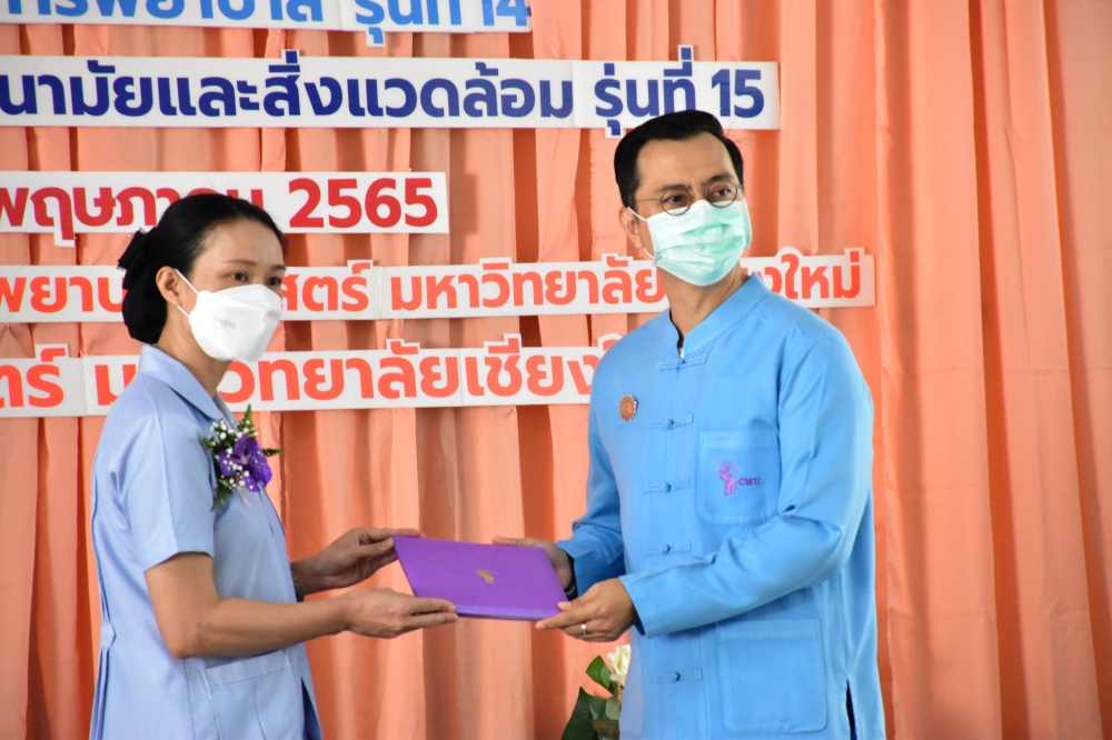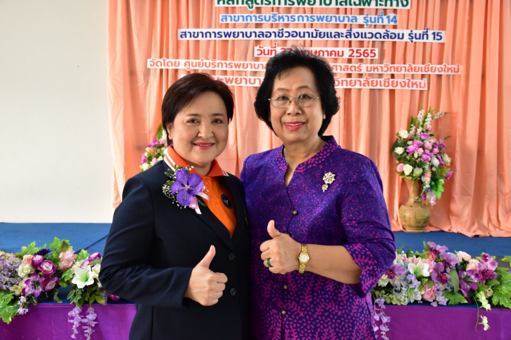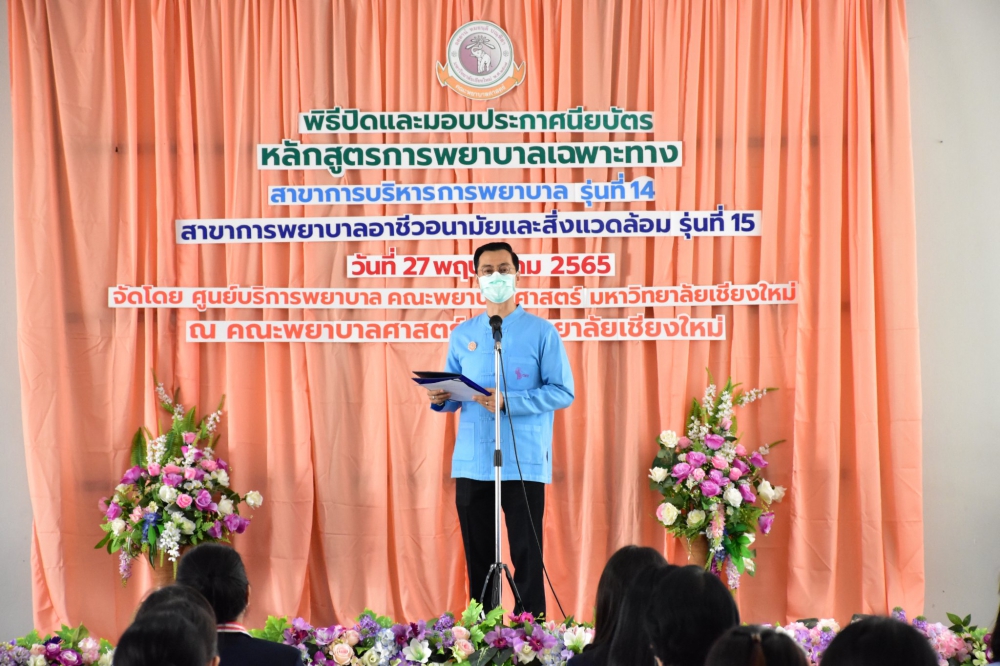 ศูนย์บริการพยาบาล คณะพยาบาลศาสตร์ มหาวิทยาลัยเชียงใหม่ จัดพิธีปิดและมอบประกาศนียบัตรการอบรมการพยาบาลเฉพาะทางสาขาการบริหารการพยาบาล รุ่นที่ 14 และ สาขาการพยาบาลอาชีวอนามัยและสิ่งแวดล้อม รุ่นที่ 15 โดยมี ผู้ช่วยศาสตราจารย์ ดร.ธานี แก้วธรรมานุกูล คณบดีคณะพยาบาลศาสตร์ เป็นประธาน ผู้ช่วยศาสตราจารย์ ดร.บุญพิชชา จิตต์ภักดี ประธานคณะกรรมการสาขาการบริหารการพยาบาล ผู้ช่วยศาสตราจารย์ ดร.วรันธรณ์ จงรุ่งโรจน์สกุล ประธานคณะกรรมการสาขาการพยาบาลอาชีวอนามัยและสิ่งแวดล้อม กล่าวรายงาน และ รองศาสตราจารย์ฉวีวรรณ ธงชัย ผู้อำนวยการศูนย์บริการพยาบาล กล่าวแสดงความยินดี ณ ข่วงม่วนใจ๋ ชั้น 1 อาคาร 2 คณะพยาบาลศาสตร์ เมื่อวันศุกร์ที่ 27 พฤษภาคม 2565