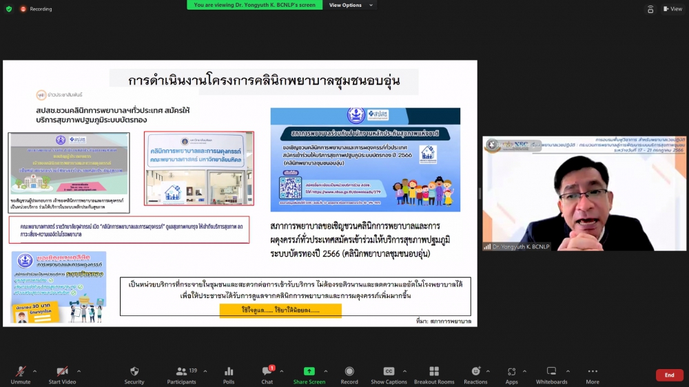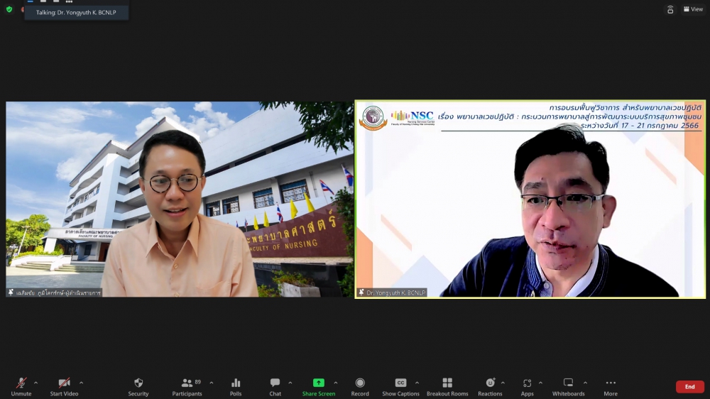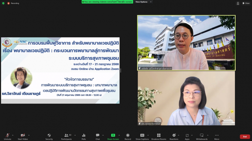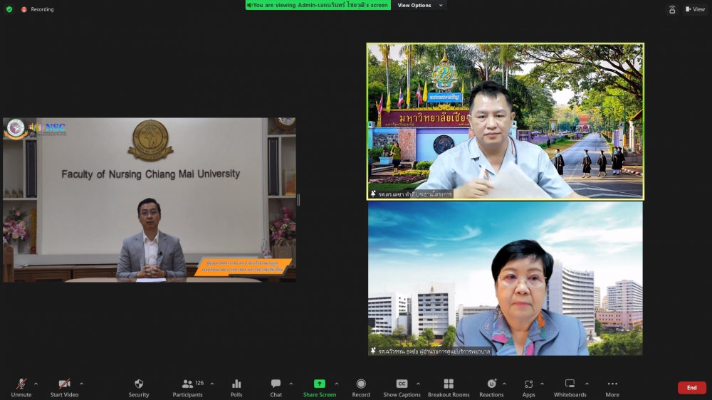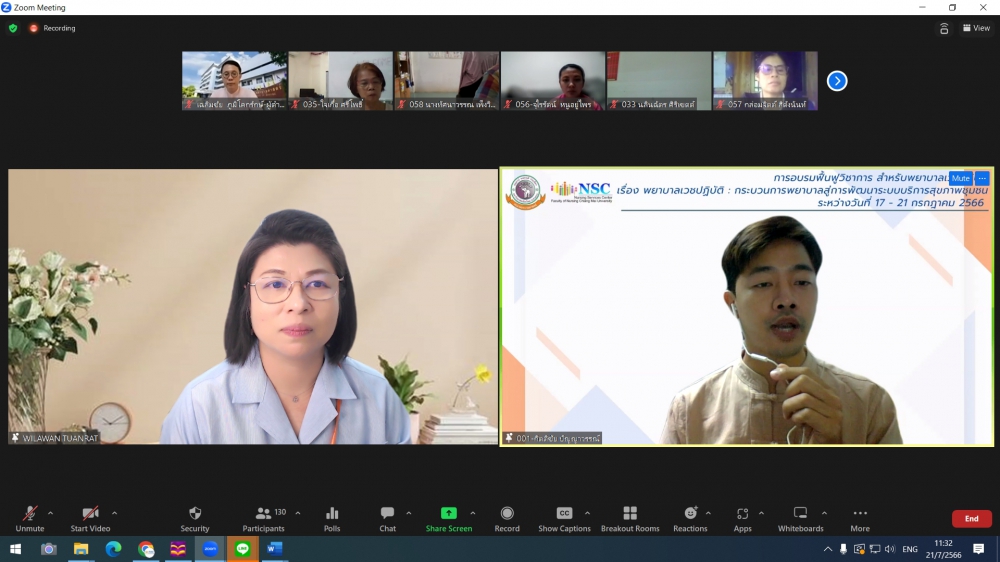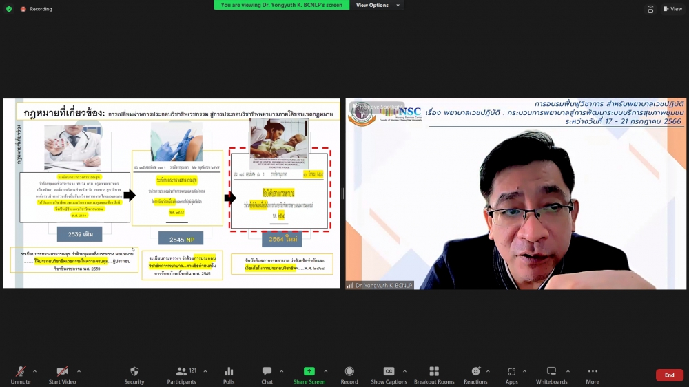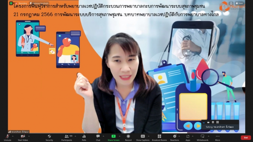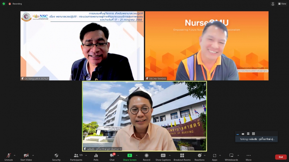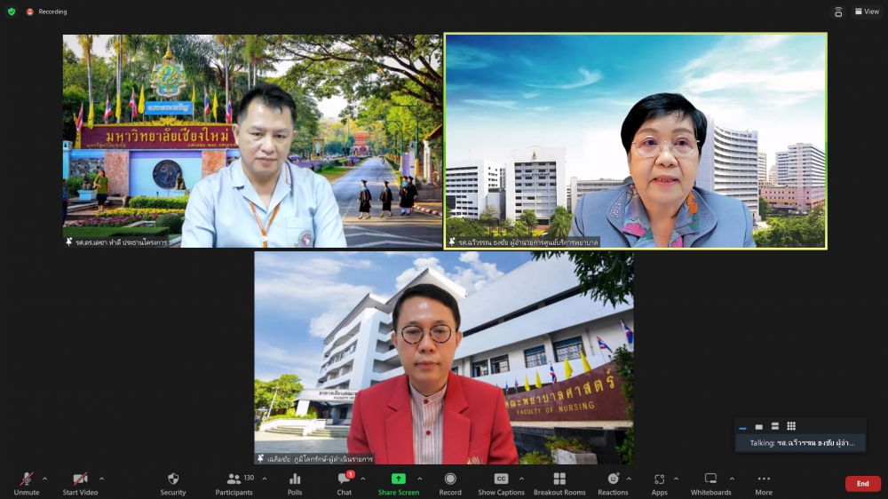 ศูนย์บริการพยาบาล คณะพยาบาลศาสตร์ มหาวิทยาลัยเชียงใหม่ จัดพิธีเปิดการอบรมฟื้นฟูวิชาการ สำหรับพยาบาลเวชปฏิบัติ เรื่อง พยาบาลเวชปฏิบัติ: กระบวนการพยาบาลสู่การพัฒนาระบบบริการสุขภาพชุมชน โดยมี ผู้ช่วยศาสตราจารย์ ดร.ธานี แก้วธรรมานุกูล คณบดีคณะพยาบาลศาสตร์ เป็นประธานกล่าวเปิด รองศาสตราจารย์ ดร.เดชา ทำดี ประธานโครงการฯ กล่าวรายงาน และ รองศาสตราจารย์ฉวีรวรรณ ธงชัย ผู้อำนวยการศูนย์บริการพยาบาล กล่าวต้อนรับ การอบรมจัดระหว่างวันที่ 17-21 กรกฎาคม 2566 ผ่านระบบ Zoom Meeting