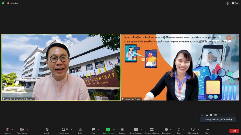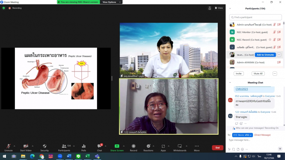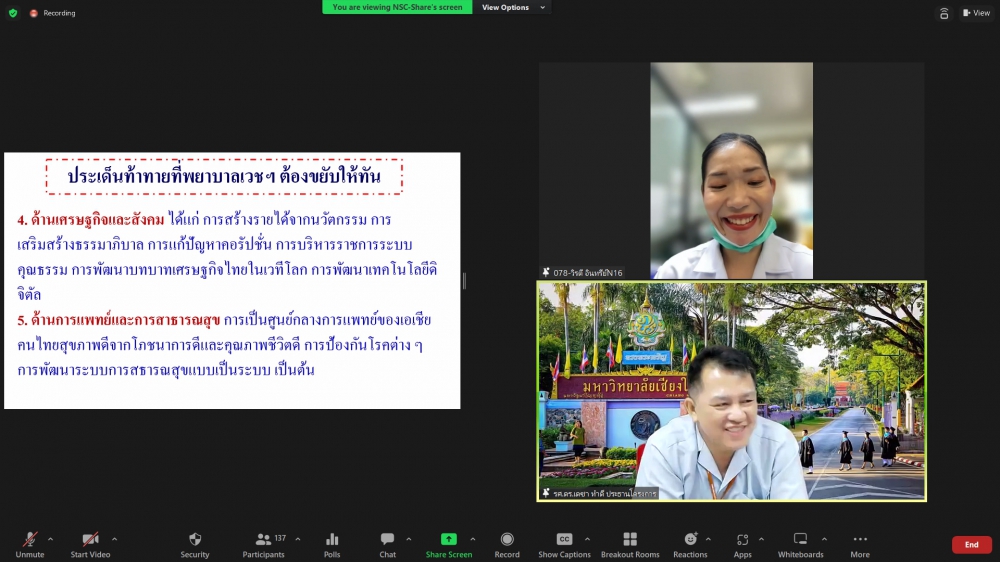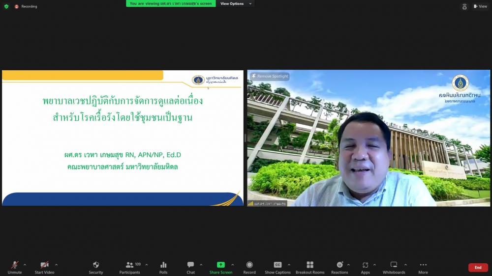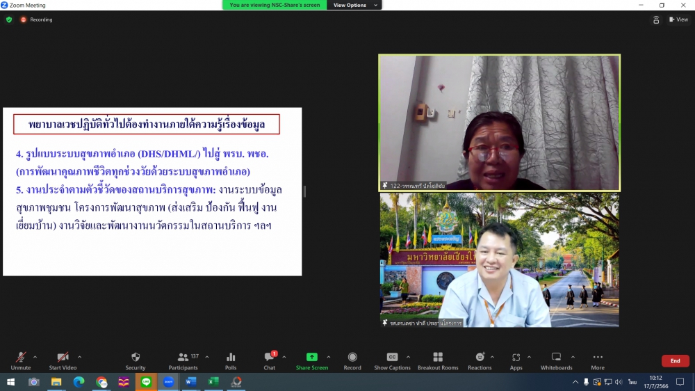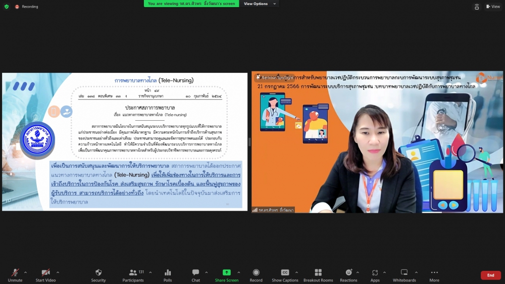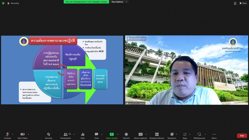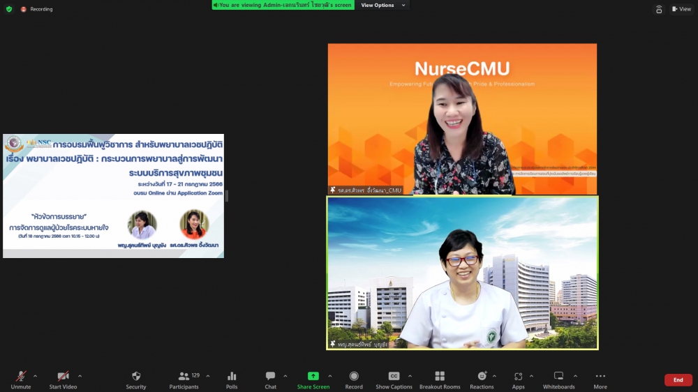 ศูนย์บริการพยาบาล คณะพยาบาลศาสตร์ มหาวิทยาลัยเชียงใหม่ จัดพิธีเปิดการอบรมฟื้นฟูวิชาการ สำหรับพยาบาลเวชปฏิบัติ เรื่อง พยาบาลเวชปฏิบัติ: กระบวนการพยาบาลสู่การพัฒนาระบบบริการสุขภาพชุมชน โดยมี ผู้ช่วยศาสตราจารย์ ดร.ธานี แก้วธรรมานุกูล คณบดีคณะพยาบาลศาสตร์ เป็นประธานกล่าวเปิด รองศาสตราจารย์ ดร.เดชา ทำดี ประธานโครงการฯ กล่าวรายงาน และ รองศาสตราจารย์ฉวีรวรรณ ธงชัย ผู้อำนวยการศูนย์บริการพยาบาล กล่าวต้อนรับ การอบรมจัดระหว่างวันที่ 17-21 กรกฎาคม 2566 ผ่านระบบ Zoom Meeting