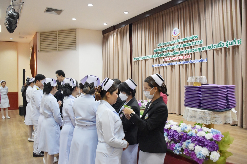 พิธีปิดและมอบประกาศนียบัตรหลักสูตรเฉพาะทางสาขาการพยาบาลผู้ป่วยโรคติดเชื้อและการควบคุมการติดเชื้อ รุ่นที่ 18ผู้ช่วยศาสตราจารย์ ดร.ธานี แก้วธรรมานุกูล คณบดีคณะพยาบาลศาสตร์ มหาวิทยาลัยเชียงใหม่ เป็นประธานในพิธีปิดและมอบประกาศนียบัตรหลักสูตรการพยาบาลเฉพาะทางสาขาการพยาบาลผู้ป่วยโรคติดเชื้อและการควบคุมการติดเชื้อ รุ่นที่ 18 โดยมี รองศาสตราจารย์ ดร.วันชัย เลิศวัฒนวิลาศ ประธานกรรมการบริหารหลักสูตร กล่าวรายงาน รองศาสตราจารย์ฉวีวรรณ ธงชัย ผู้อำนวยการศูนย์บริการพยาบาล กล่าวแสดงความยินดีแก่ผู้สำเร็จการอบรม และคณาจารย์จากคณะพยาบาลศาสตร์ มช. รวมถึงพี่เลี้ยงแหล่งฝึกจากโรงพยาบาลมหาราชนครเชียงใหม่ และโรงพยาบาลนครพิงค์ ร่วมเป็นเกียรติแสดงความยินดีในพิธี ณ ห้องประชุมชั้น 5 อาคาร 4 คณะพยาบาลศาสตร์ เมื่อวันศุกร์ที่ 4 สิงหาคม 2566