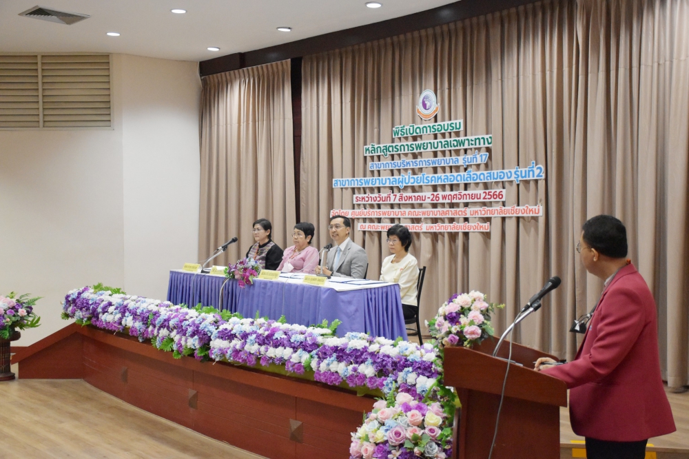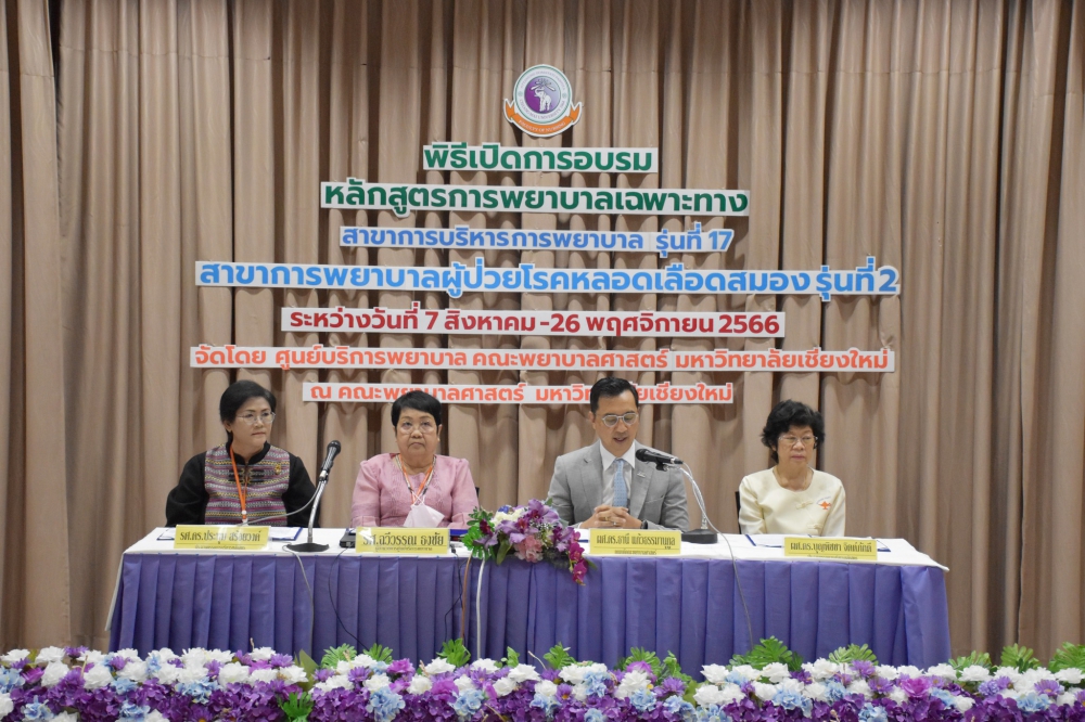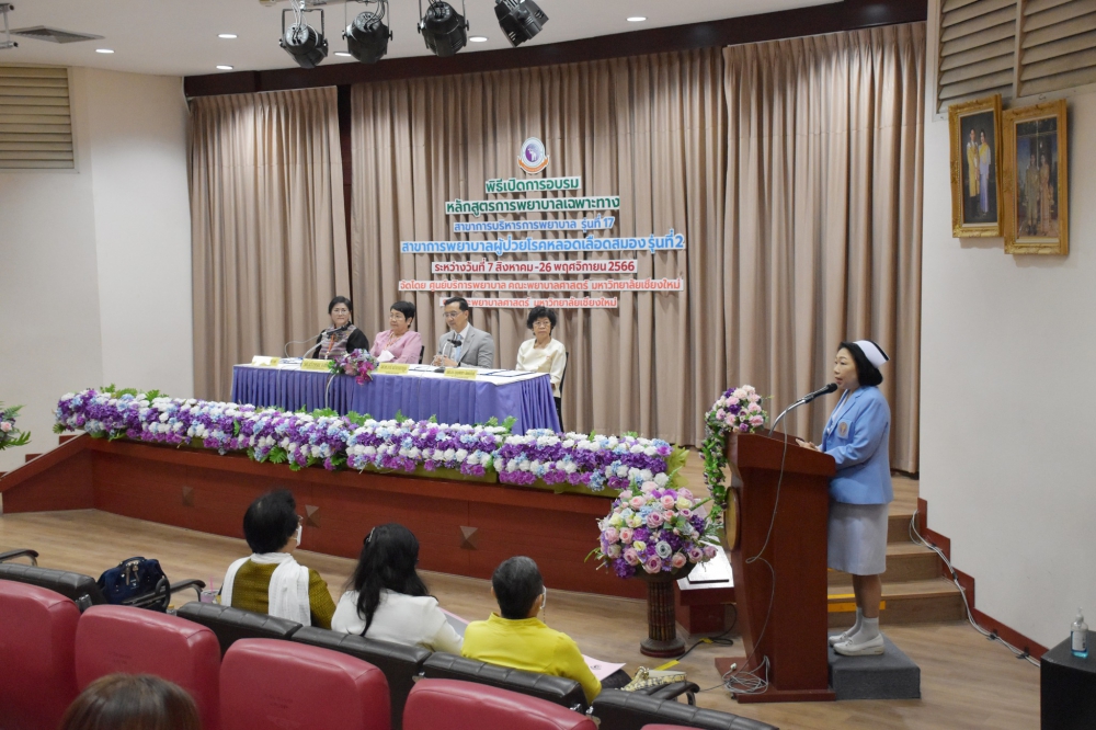 พิธีเปิดการอบรมหลักสูตรการพยาบาลเฉพาะทางสาขาการบริหารการพยาบาล รุ่นที่ 17 และ สาขาการพยาบาลผู้ป่วยโรคหลอดเลือดสมอง รุ่นที่ 2ศูนย์บริการพยาบาล คณะพยาบาลศาสตร์ มหาวิทยาลัยเชียงใหม่ จัดพิธีเปิดการอบรมหลักสูตรการพยาบาลเฉพาะทางสาขาการบริหารการพยาบาล รุ่นที่ 17 และ สาขาการพยาบาลผู้ป่วยโรคหลอดเลือดสมอง รุ่นที่ 2 โดยมี ผู้ช่วยศาสตราจารย์ ดร.ธานี แก้วธรรมานุกูล คณบดีคณะพยาบาลศาสตร์ เป็นประธาน ผู้ช่วยศาสตราจารย์ ดร.บุญพิชชา จิตต์ภักดี ประธานกรรมการหลักสูตรเฉพาะทางสาขาการบริหารการพยาบาล และ รองศาสตราจารย์ ดร.ประทุม สร้อยวงค์ ประธานกรรมการหลักสูตรเฉพาะทางสาขาการพยาบาลผู้ป่วยโรคหลอดเลือดสมอง กล่าวรายงาน โดยมี รองศาสตราจารย์ ฉวีวรรณ ธงชัย ผู้อำนวยการศูนย์บริการพยาบาล คุณนิรมัย มณีรัตน์ รองผู้อำนวยการภารกิจด้านการพยาบาลโรงพยาบาลประสาทเชียงใหม่ และ คุณจรรยา กาวีเมือง ตัวแทนพยาบาลพี่เลี้ยง โรงพยาบาลนครพิงค์ กล่าวต้อนรับ ณ ห้องประชุมชั้น 5 อาคาร 4 คณะพยาบาลศาสตร์ มหาวิทยาลัยเชียงใหม่การอบรมทั้ง 2 หลักสูตรจัดขึ้นระหว่างวันที่ 7 สิงหาคม – 26 พฤศจิกายน 2566 มีผู้เข้ารับการอบรมจากทั่วประเทศจำนวน 36 คน และ 37 คน ตามลำดับ