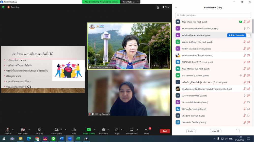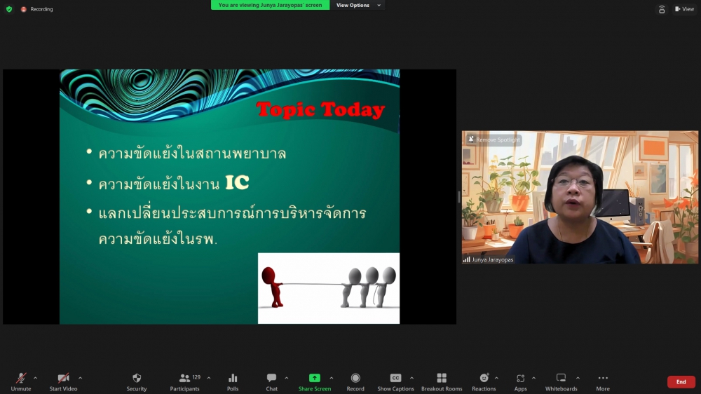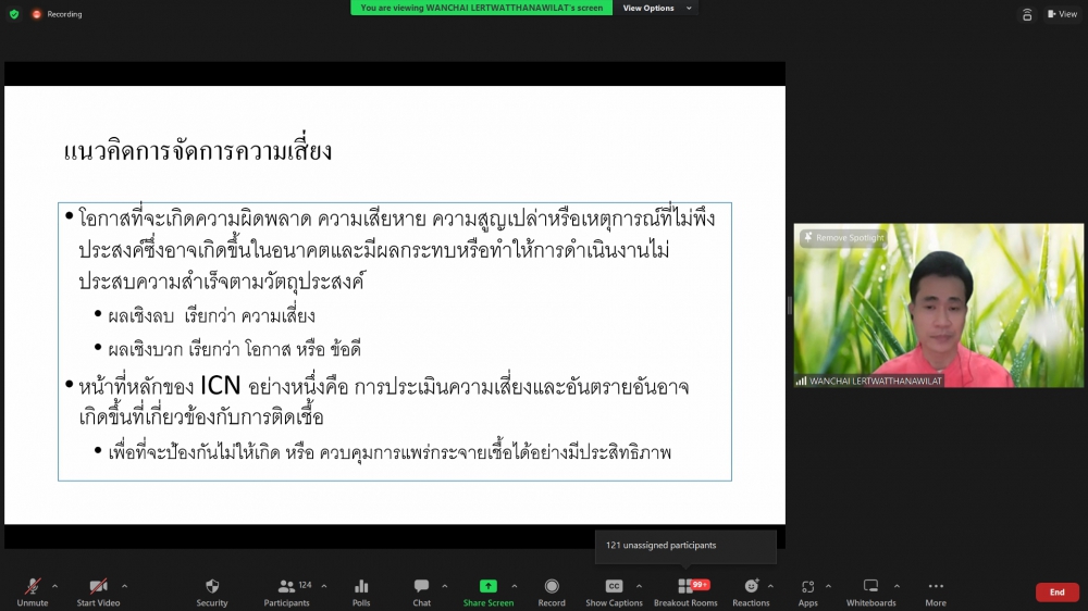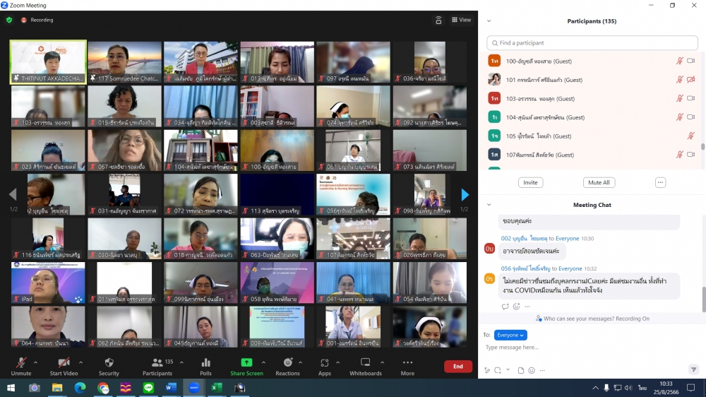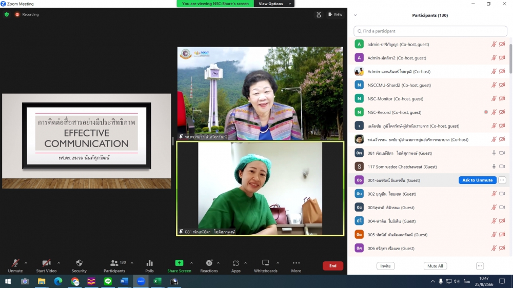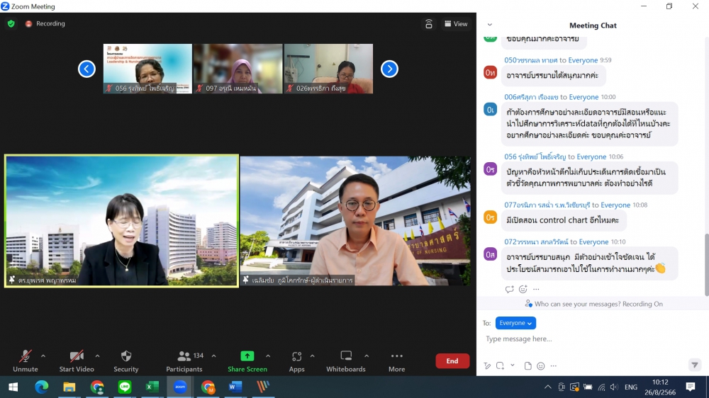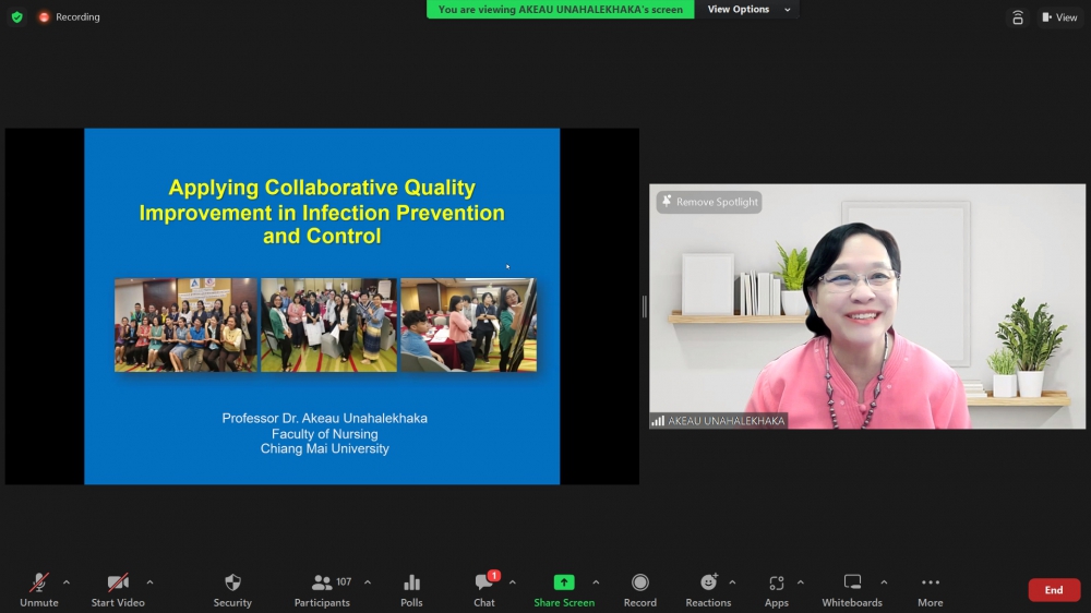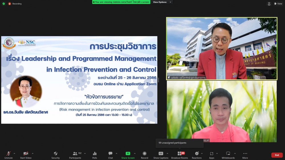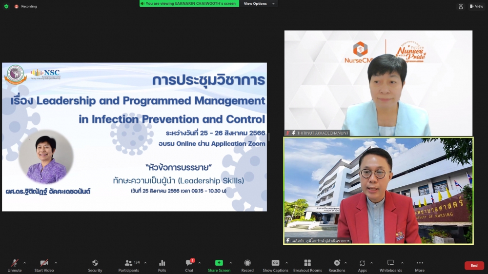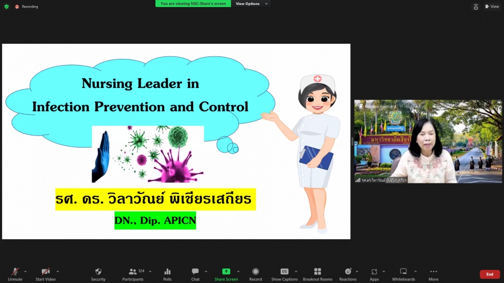 โครงการอบรมระยะสั้น เรื่อง Leadership and Pragrammed Management in Infection Prevention and Control (Online)ศูนย์บริการพยาบาล คณะพยาบาลศาสตร์ มหาวิทยาลัยเชียงใหม่ จัดโครงการอบรมระยะสั้น เรื่อง Leadership and Pragrammed Management in Infection Prevention and Control (Online) ขึ้นระหว่างวันที่ 25-26 สิงหาคม 2566 ผ่าน zoom meeting โดยพิธีเปิดได้รับเกียรติจาก ผศ.ดร.ธานี แก้วธรรมานุกูล คณบดีคณะพยาบาลศาสตร์ มหาวิทยาลัยเชียงใหม่ เป็นประธานในพิธี รศ.ดร.วิลาวัณย์ พิเชียรเสถียร ประธานโครงการกล่าวรายงาน และรศ.ฉวีวรรณ ธงชัย ผู้อำนวยการศูนย์บริการพยาบาลกล่าวต้อนรับการอบรมดังกล่าวมีความจำเป็นและความสำคัญในการพัฒนาพยาบาลวิชาชีพที่ปฏิบัติในบทบาทพยาบาลควบคุมการติดเชื้อ ให้เป็นผู้นำการดำเนินงานโครงการป้องกันและควบคุมการติดเชื้อในโรงพยาบาลอย่างมีประสิทธิภาพ และเป็นเวทีแลกเปลี่ยนเรียนรู้ของผู้เชี่ยวชาญและพยาบาลที่มีประสบการณ์ด้านการควบคุมการติดเชื้อซึ่งจะเป็นการสร้างเสริมศักยภาพการปฏิบัติงานในฐานะผู้นำทางการพยาบาลด้านการป้องกันและควบคุมการติดเชื้อในโรงพยาบาลต่อไป