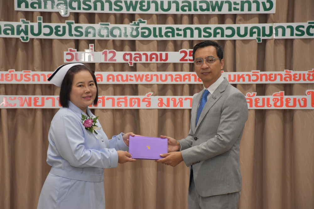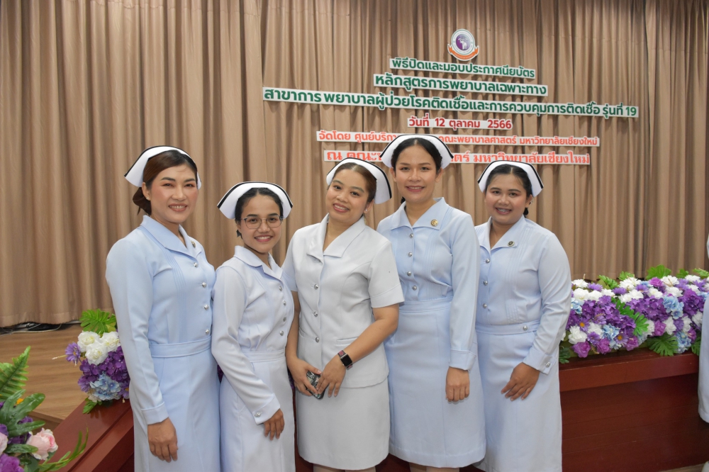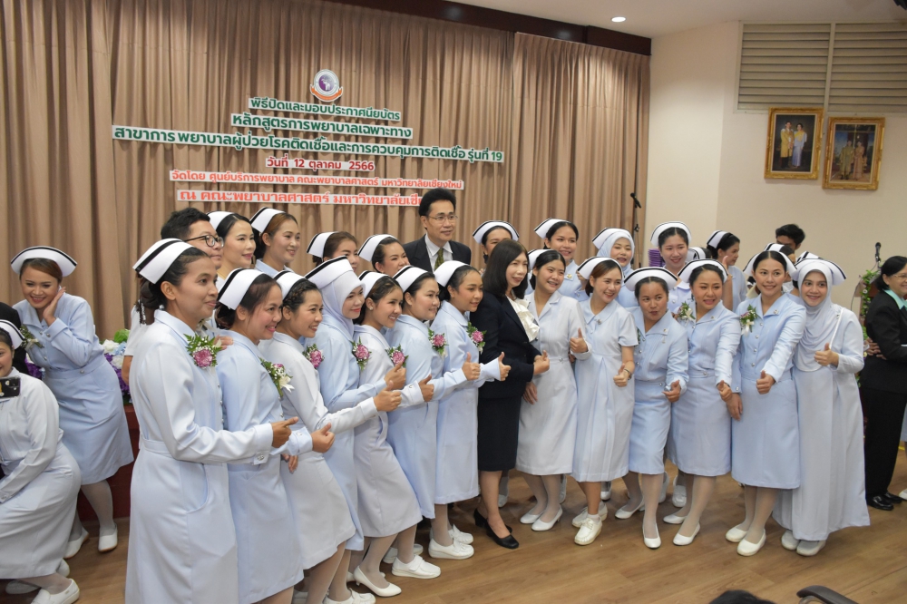 วันพฤหัสบดีที่ 12 ตุลาคม 2566 ผู้ช่วยศาสตราจารย์ ดร.ธานี แก้วธรรมานุกูล คณบดีคณะพยาบาลศาสตร์ มหาวิทยาลัยเชียงใหม่ เป็นประธานในพิธีปิดและมอบประกาศนียบัตรหลักสูตรการพยาบาลเฉพาะทางสาขาการพยาบาลผู้ป่วยโรคติดเชื้อและการควบคุมการติดเชื้อ รุ่นที่ 19 โดยมี รองศาสตราจารย์ ดร.วันชัย เลิศวัฒนวิลาศ ประธานกรรมการบริหารหลักสูตรฯ กล่าวรายงาน และ รองศาสตราจารย์ฉวีวรรณ ธงชัย ผู้อำนวยการศูนย์บริการพยาบาล กล่าวแสดงความยินดี ในโอกาสนี้ได้รับเกียรติจาก คณาจารย์คณะพยาบาลศาสตร์ ตลอดจนพี่เลี้ยงแหล่งฝึกจากโรงพยาบาลมหาราชนครเชียงใหม่ และโรงพยาบาลนครพิงค์ จ.เชียงใหม่ ร่วมแสดงความยินดี ณ ห้องประชุมชั้น 5 อาคาร 4 คณะพยาบาลศาสตร์