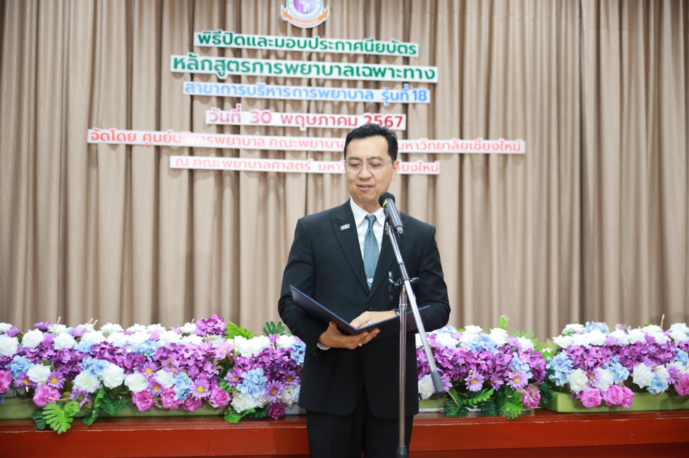 ผู้ช่วยศาสตราจารย์ ดร.ธานี แก้วธรรมานุกูล คณบดีคณะพยาบาลศาสตร์ มหาวิทยาลัยเชียงใหม่ เป็นประธานในพิธีปิดและมอบมอบประกาศนียบัตรหลักสูตรการพยาบาลเฉพาะทางสาขาการบริหารการพยาบาล รุ่นที่ 18 โดยมี ผู้ช่วยศาสตราจารย์ ดร.บุญพิชชา จิตต์ภักดี ประธานกรรมการบริหารหลักสูตร กล่าวรายงาน และ รองศาสตราจารย์ฉวีวรรณ ธงชัย ผู้อำนวยการศูนย์บริการพยาบาล กล่าวแสดงความยินดี ณ ห้องประชุมชั้น 5 อาคาร 4 คณะพยาบาลศาสตร์ เมื่อวันพฤหัสบดีที่ 30 พฤษภาคม 2567