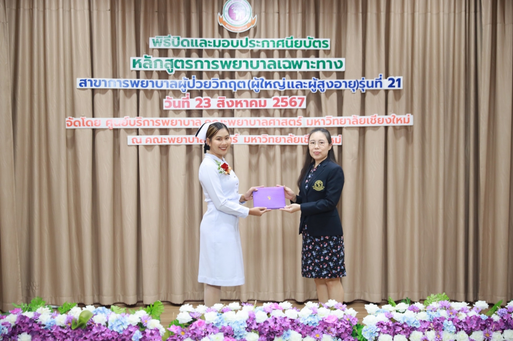 วันศุกร์ที่ 23 สิงหาคม 2567 ผู้ช่วยศาสตราจารย์ ปิยวรรณ สวัสดิ์สิงห์ ผู้ช่วยคณบดีด้านพัฒนานักศึกษาและนักศึกษาเก่าสัมพันธ์ เป็นประธานในพิธีปิดและมอบประกาศนียบัตรหลักสูตรการพยาบาลเฉพาะทางสาขาการพยาบาลผู้ป่วยวิกฤต (ผู้ใหญ่และผู้สูงอายุ) รุ่นที่ 21โดยมี ผู้ช่วยศาสตราจารย์ ดร.จิตตวดี เหรียญทอง กรรมการบริหารหลักสูตรกล่าวรายงาน และ รองศาสตราจารย์ฉวีวรรณ ธงชัย ผู้อำนวยการศูนย์บริการพยาบาล และคุณศรีสังวาลย์ เนตรอนงค์ หัวหน้าภารกิจด้านการพยาบาล โรงพยาบาลนครพิงค์ จ.เชียงใหม่ กล่าวแสดงความยินดีแก่ผู้สำเร็จการอบรม ณ ห้องประชุมชั้น 5 อาคาร 4 คณะพยาบาลศาสตร์ มหาวิทยาลัยเชียงใหม่