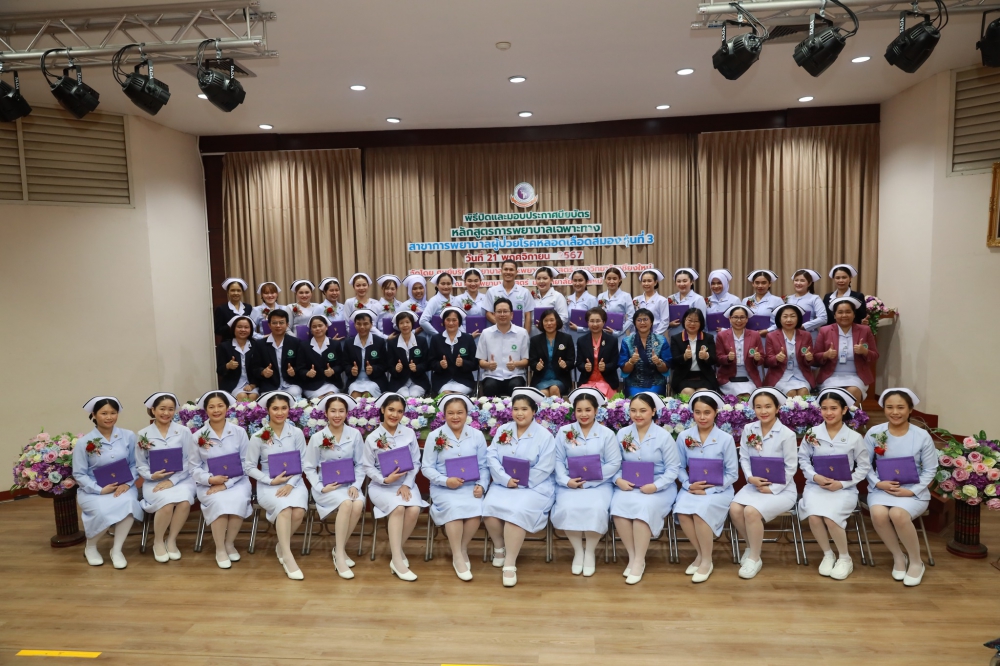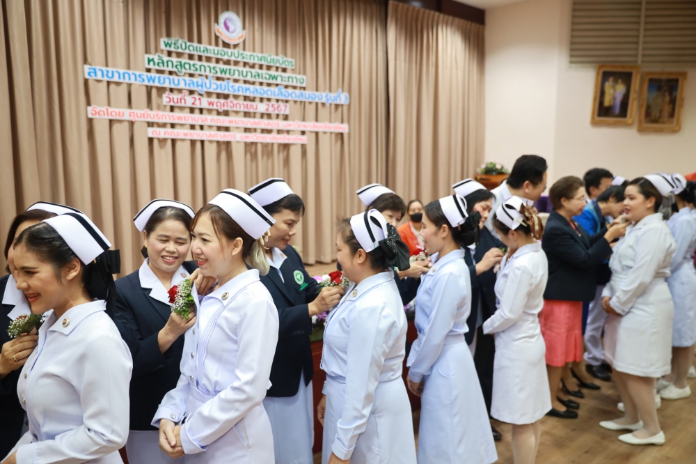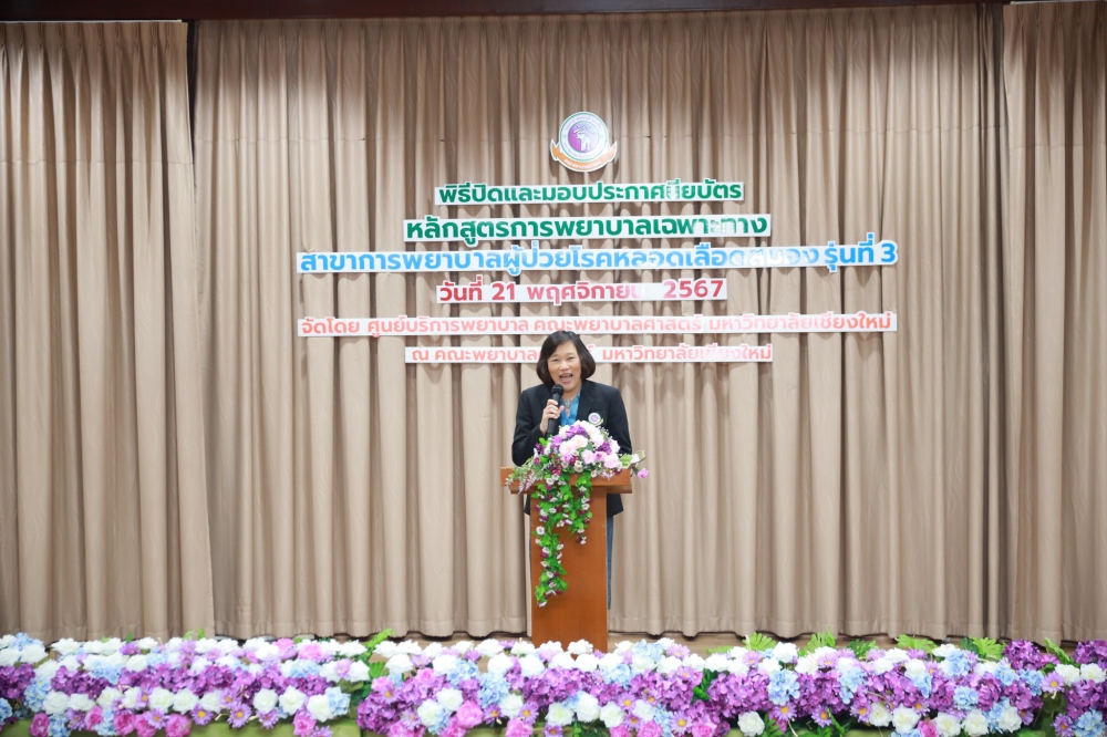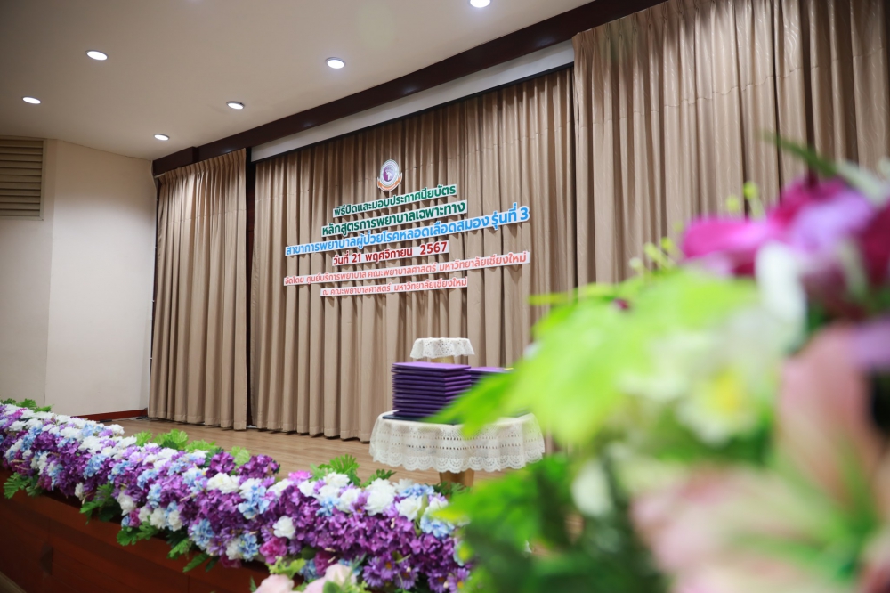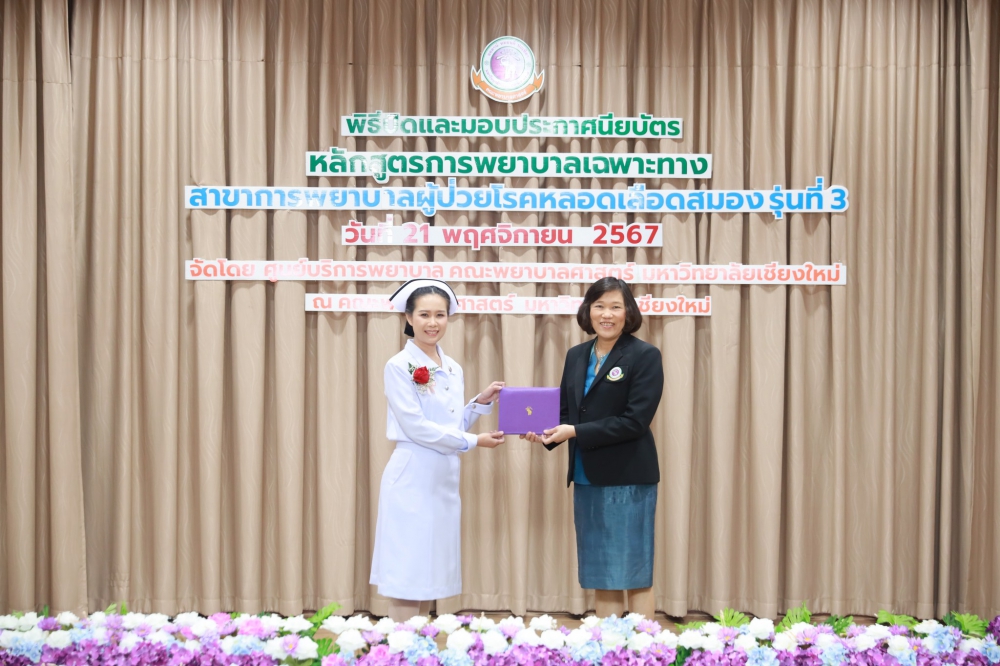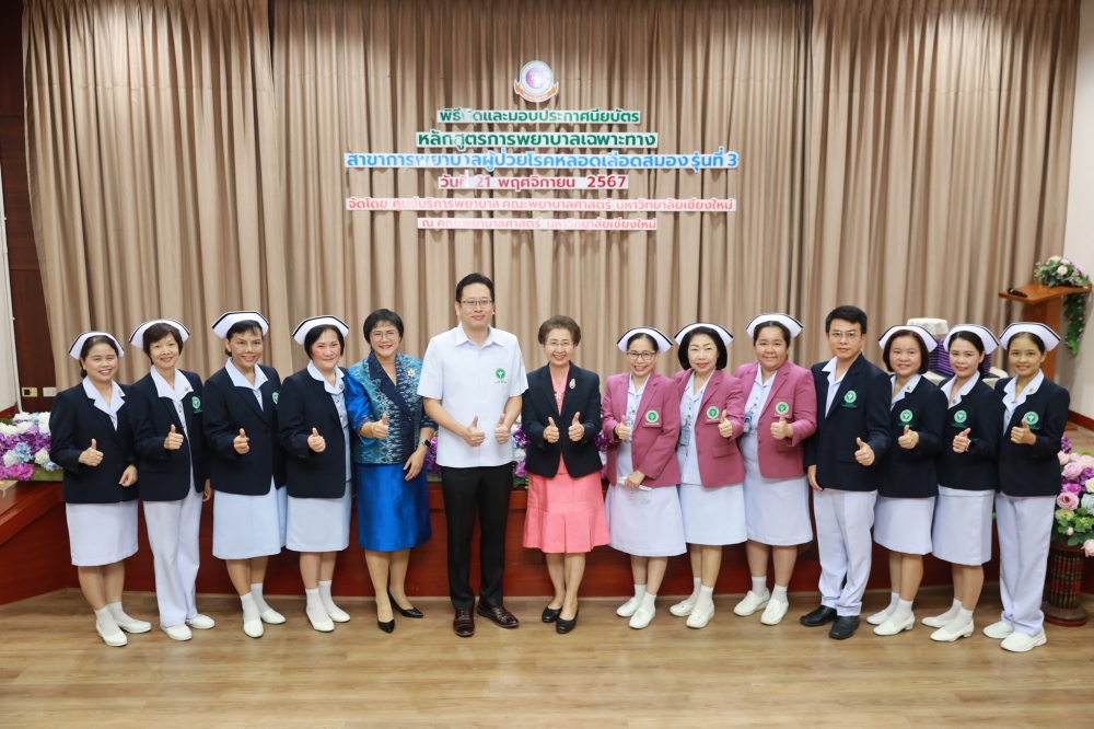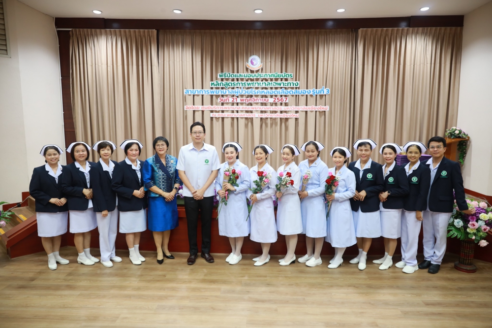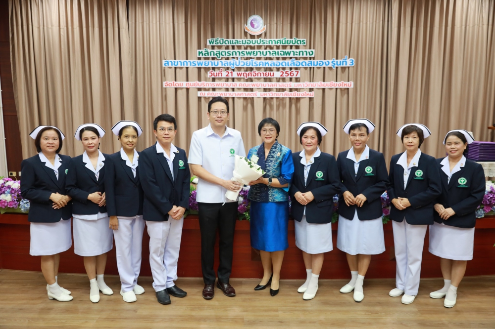 21 พฤศจิกายน 2567 ศูนย์บริการพยาบาล คณะพยาบาลศาสตร์ มหาวิทยาลัยเชียงใหม่ ร่วมกับ กลุ่มภารกิจด้านการพยาบาล โรงพยาบาลประสาทเชียงใหม่ จัดพิธีปิดและมอบประกาศนียบัตรการอบรมหลักสูตรการพยาบาลเฉพาะทางสาขาการพยาบาลผู้ป่วยโรคหลอดเลือดสมอง รุ่นที่ 3 โดยมี ผู้ช่วยศาสตราจารย์ ดร.สุภารัตน์ วังศรีคูณ คณบดีคณะพยาบาลศาสตร์ มหาวิทยาลัยเชียงใหม่ เป็นประธาน รองศาสตราจารย์ ดร.ประทุม สร้อยวงค์ ประธานกรรมการหลักสูตรฯ กล่าวรายงานและรายนามผู้สำเร็จการอบรม ศาสตราจารย์คลินิก ดร. พรรณพิไล ศรีอาภรณ์ ผู้อำนวยการศูนย์บริการพยาบาล นายแพทย์ดลสุข พงษ์นิกร ผู้อำนวยการโรงพยาบาลประสาทเชียงใหม่ และคุณจรรยา กาวีเมือง หัวหน้าหอผู้ป่วยวิกฤตโรคหลอดเลือดสมอง โรงพยาบาลนครพิงค์ กล่าวแสดงความยินดี ณ ห้องประชุมชั้น 5 อาคาร 4 คณะพยาบาลศาสตร์