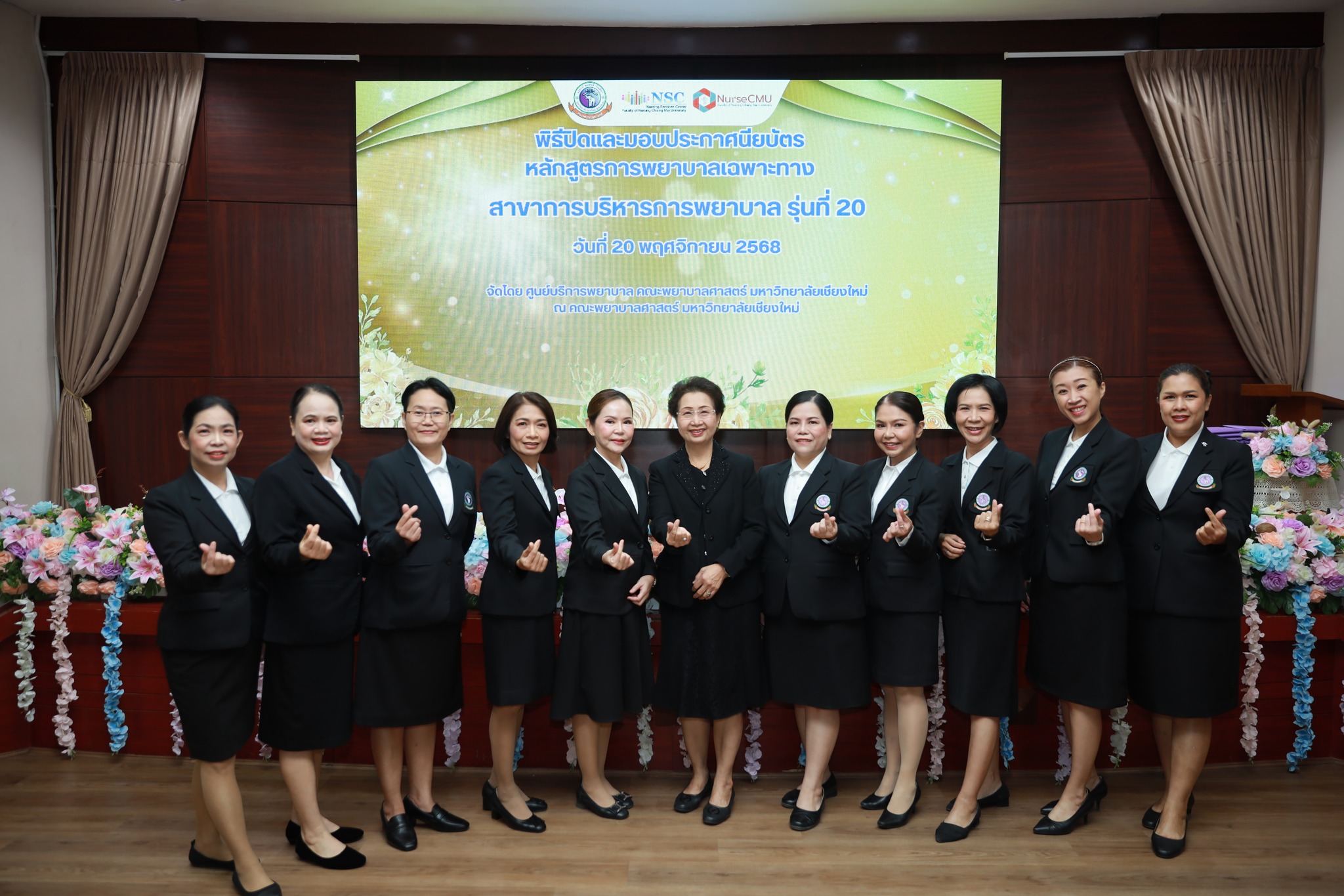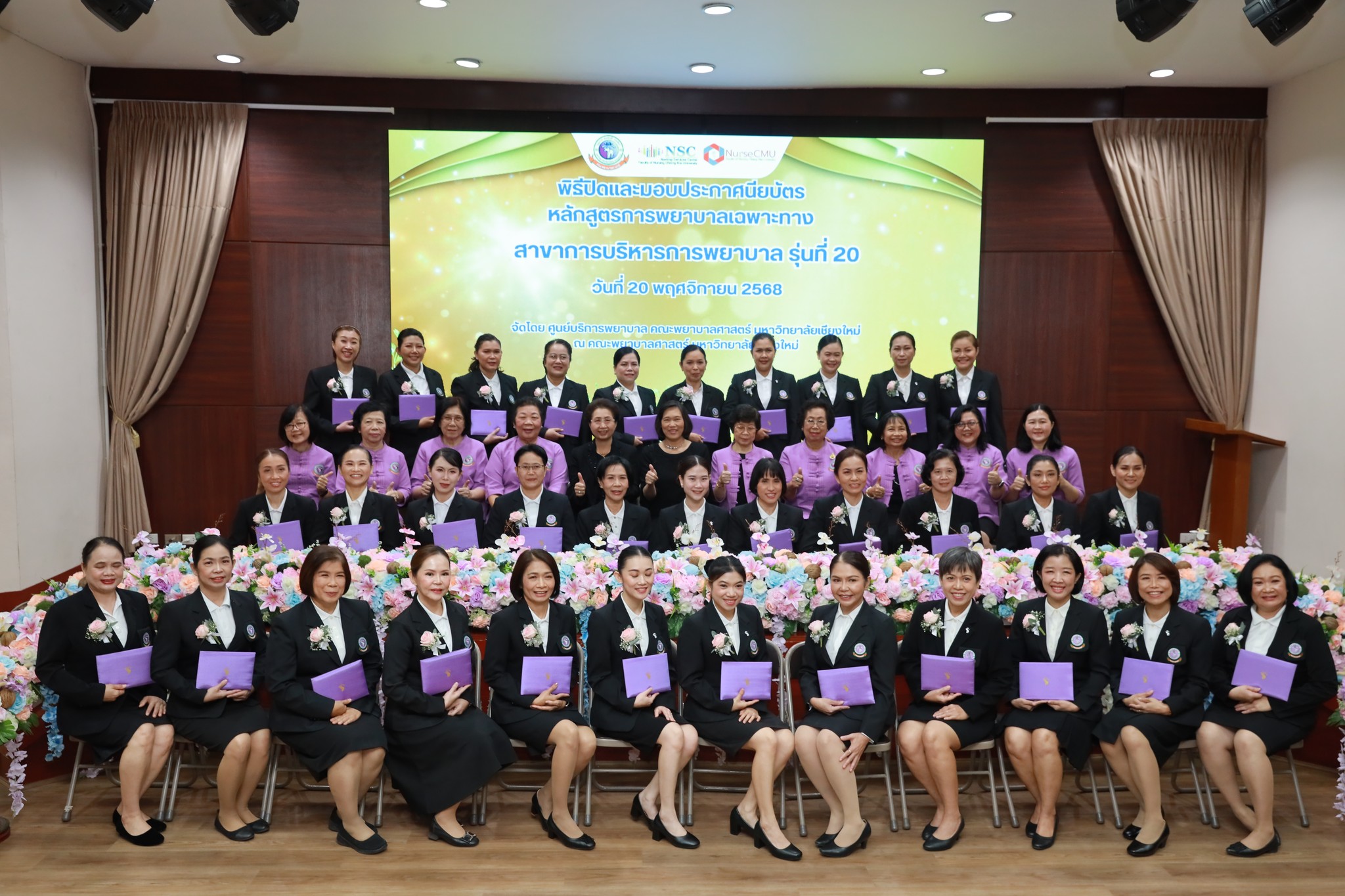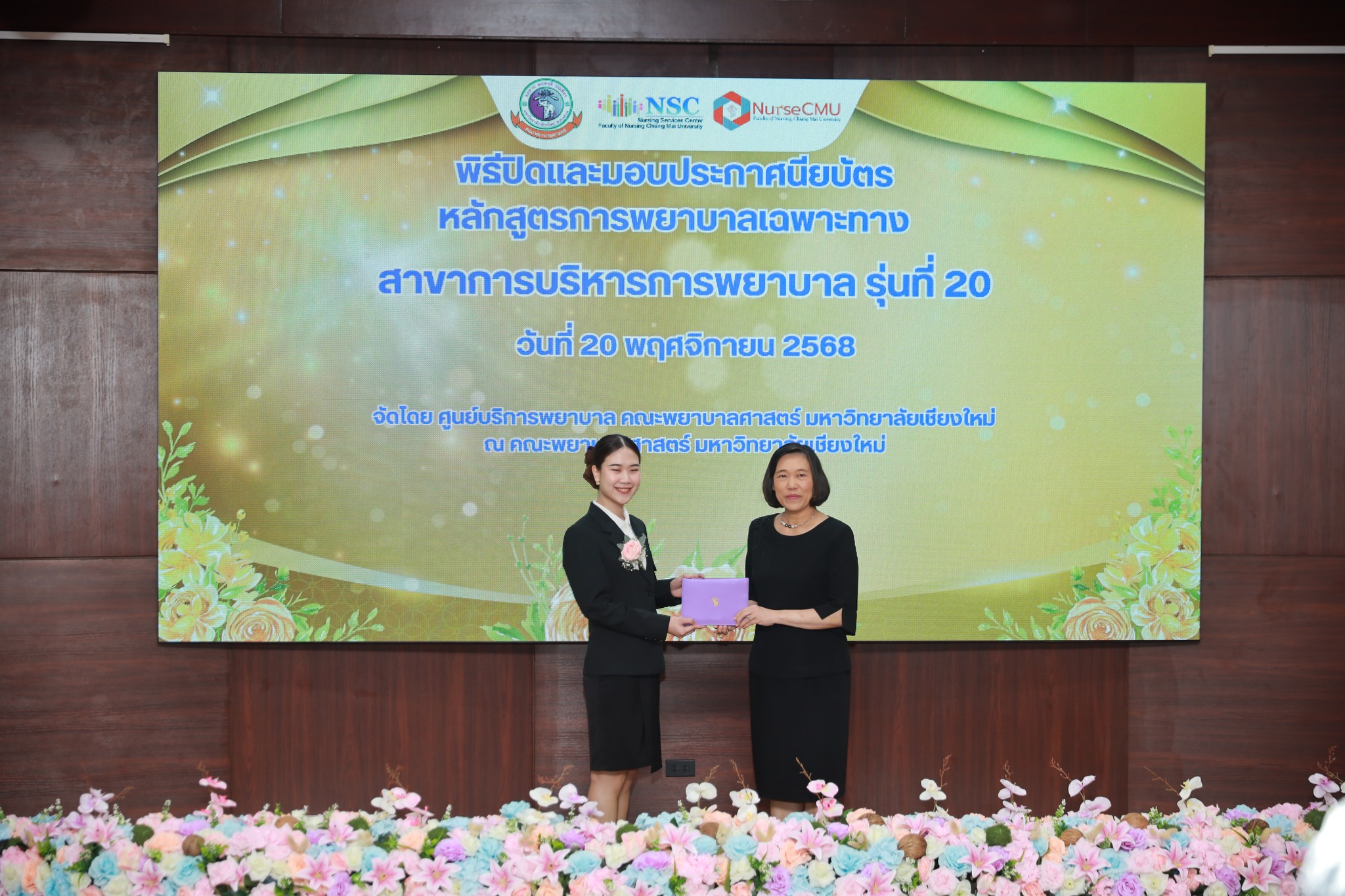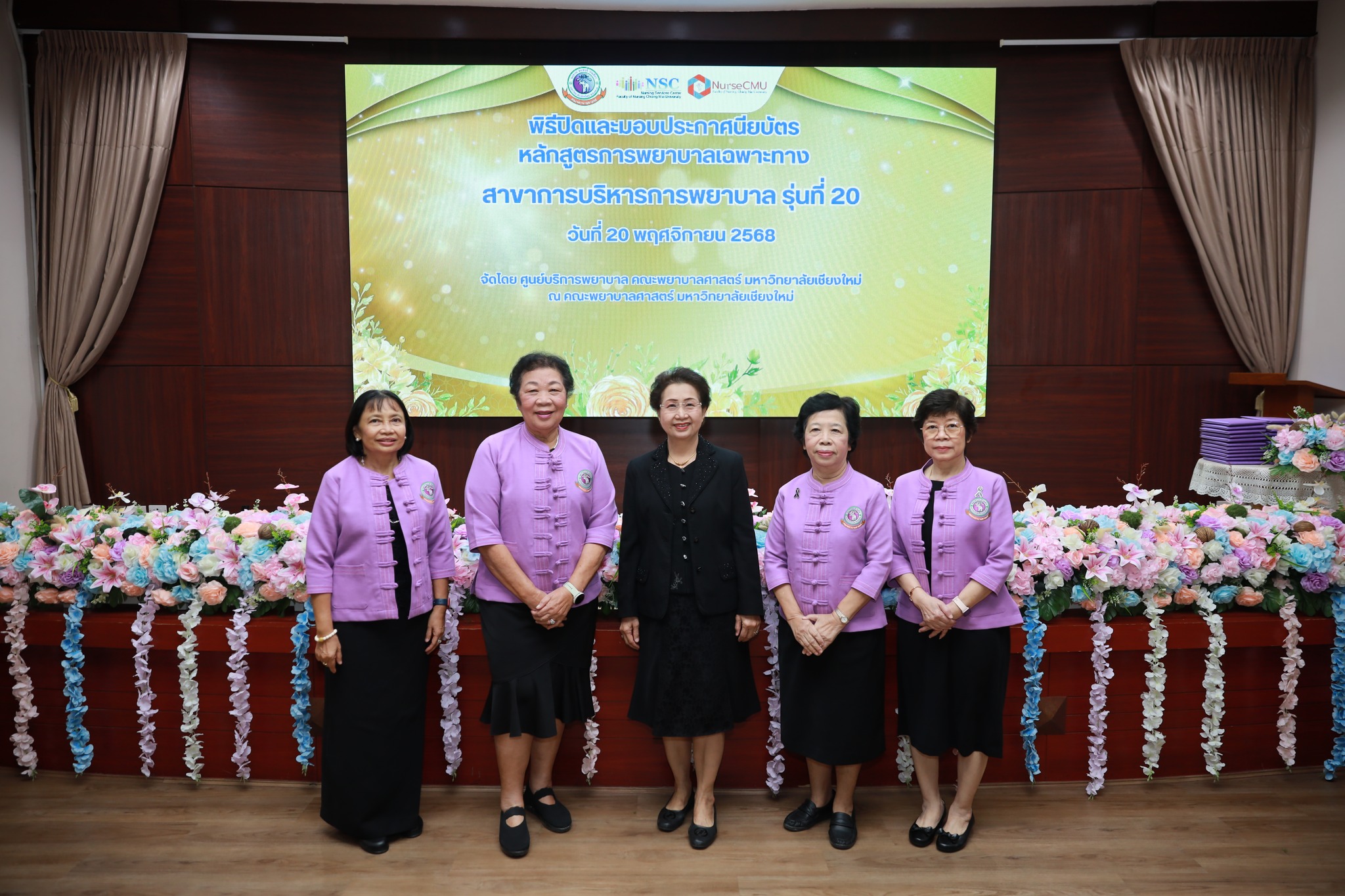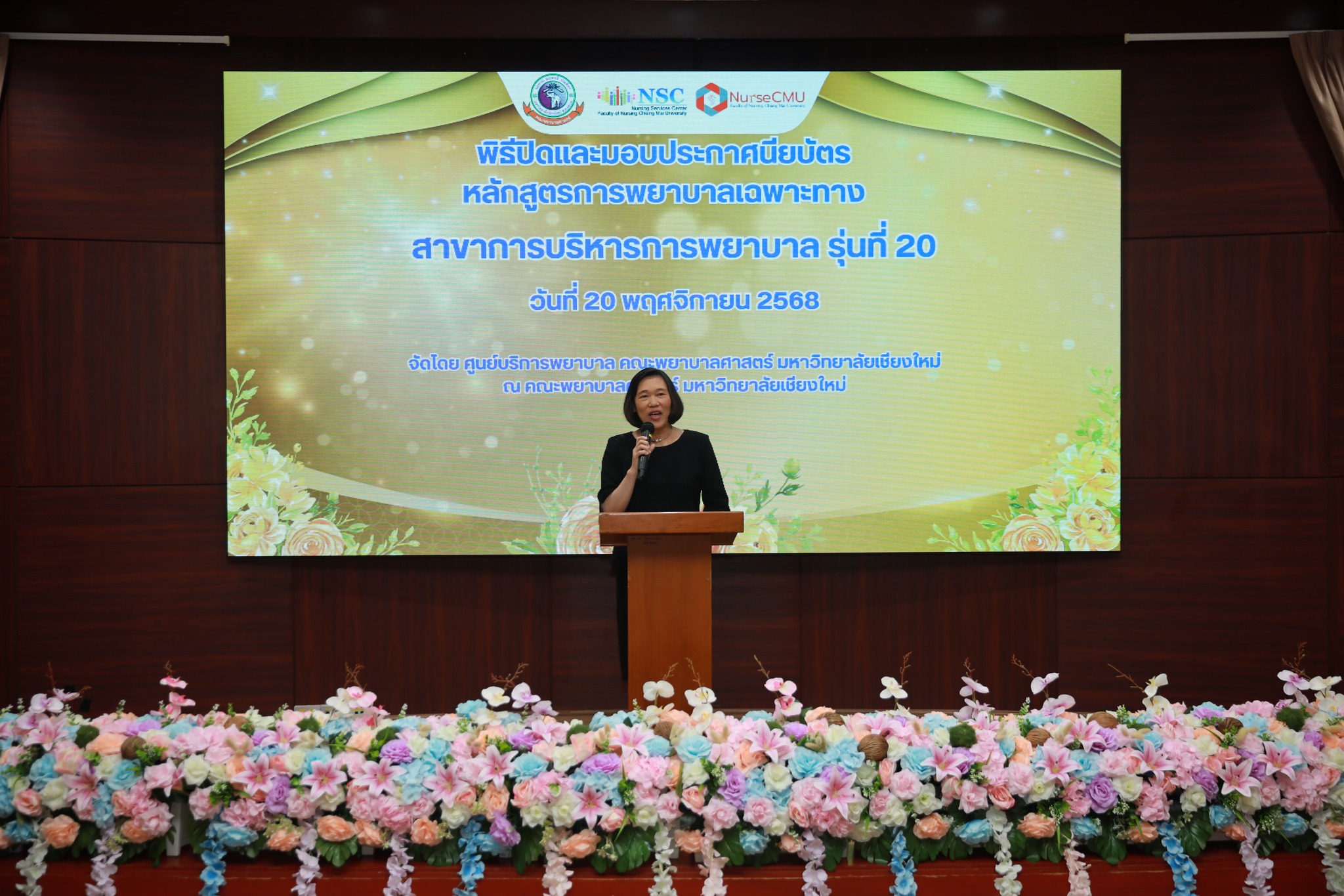 20 พฤศจิกายน 2568 ศูนย์บริการพยาบาล มหาวิทยาลัยเชียงใหม่ ได้จัดพิธีมอบประกาศนียบัตรหลักสูตรการพยาบาลเฉพาะทางสาขาการบริหารการพยาบาล รุ่นที่ 20 ณ ห้องประชุมชั้น 5 อาคาร 4 คณะพยาบาลศาสตร์ โดยได้รับเกียรติจากผู้ช่วยศาสตราจารย์ ดร.สุภารัตน์ วังศรีคูณ คณบดีคณะพยาบาลศาสตร์ เป็นประธานในพิธี ผู้ช่วยศาสตราจารย์ ดร.บุญพิชชา จิตต์ภักดี ประธานกรรมการหลักสูตรฯ กล่าวรายงาน และศาสตราจารย์คลินิก ดร.พรรณพิไล ศรีอาภรณ์ ผู้อำนวยการศูนย์บริการพยาบาล กล่าวแสดงความยินดี