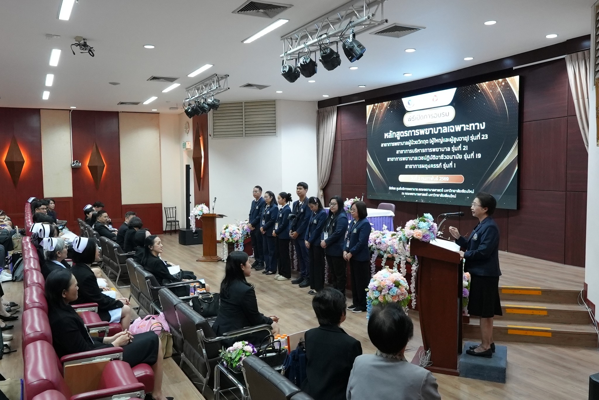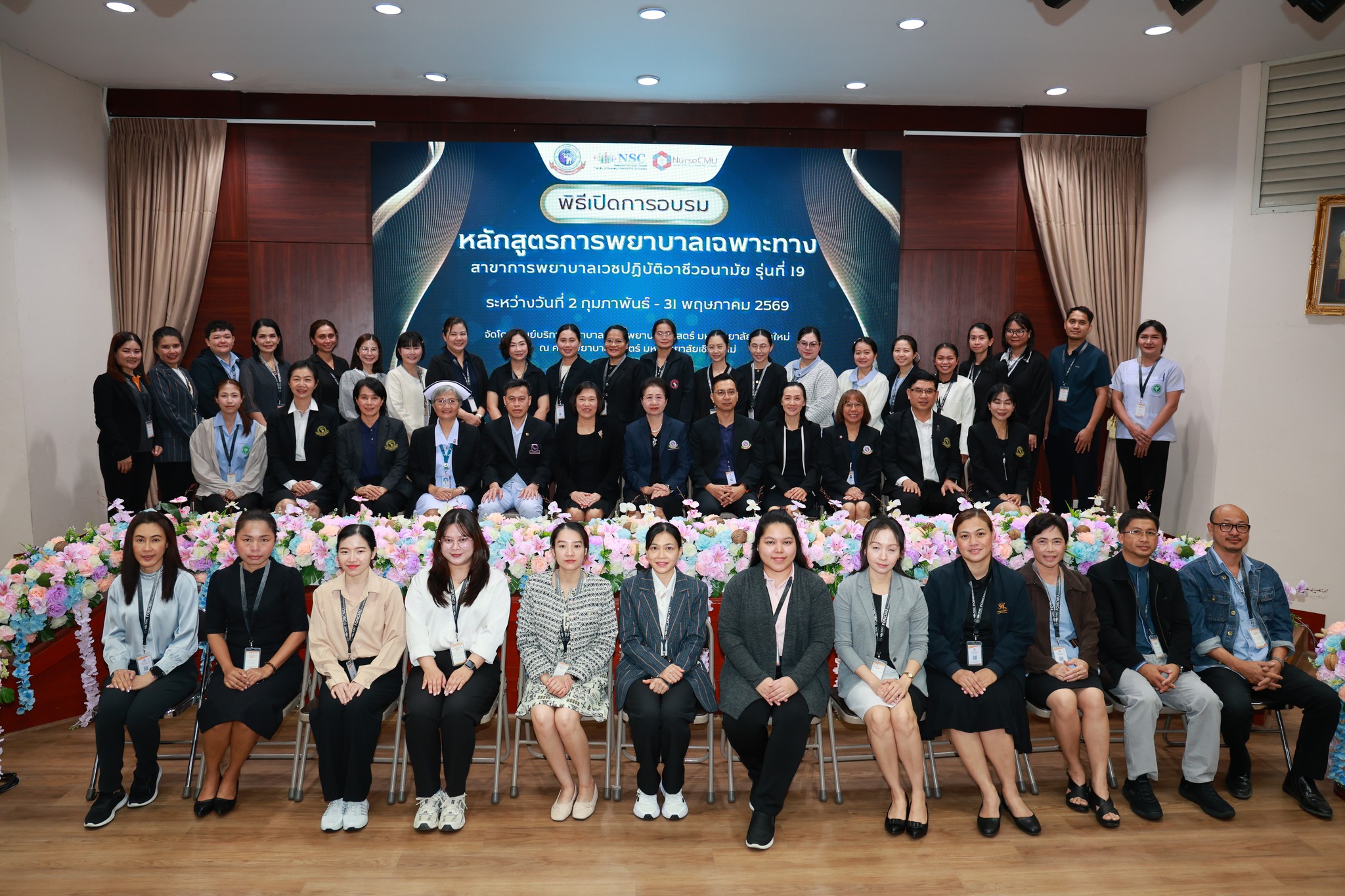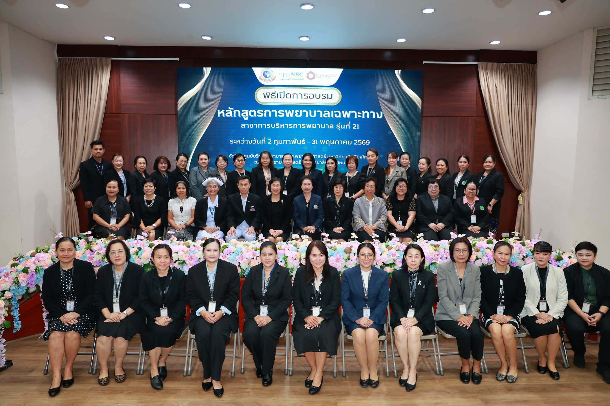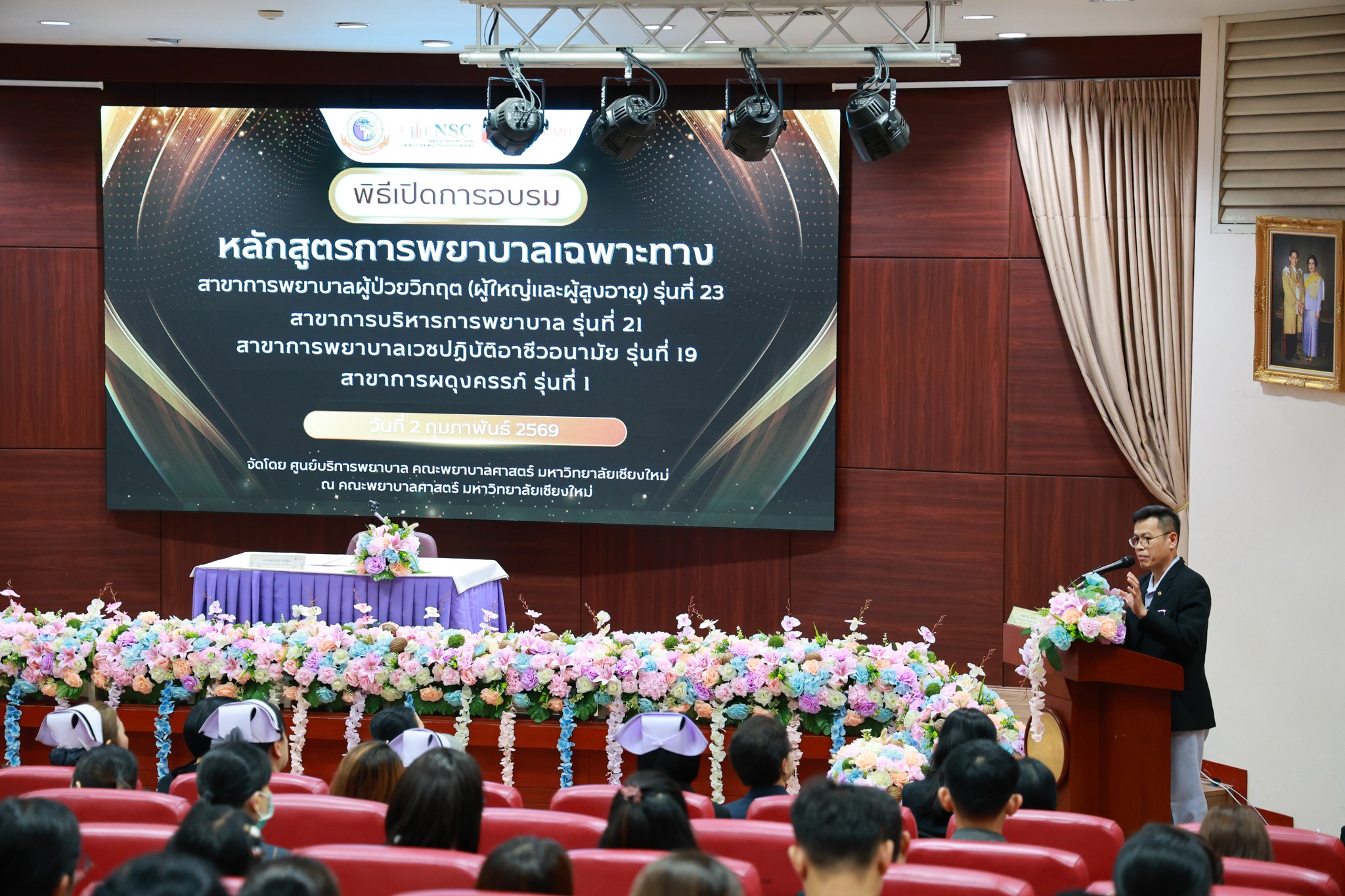 ศูนย์บริการพยาบาล คณะพยาบาลศาสตร์ มหาวิทยาลัยเชียงใหม่ จัดพิธีเปิดการอบรมการพยาบาลเฉพาะทางใน 4 หลักสูตร วันที่ 2 กุมภาพันธ์ 2569 ณ ห้องประชุม ชั้น 5 อาคาร 4 คณะพยาบาลศาสตร์ โดยมีผู้ช่วยศาสตราจารย์ ดร.สุภารัตน์ วังศรีคูณ คณบดีคณะพยาบาลศาสตร์ เป็นประธานในพิธี พร้อมด้วยประธานคณะกรรมการแต่ละสาขาได้แก่ ผู้ช่วยศาสตราจารย์ ดร.วราวรรณ อุดมความสุข ประธานคณะกรรมการสาขาการพยาบาลผู้ป่วยวิกฤต (ผู้ใหญ่และผู้สูงอายุ) ผู้ช่วยศาสตราจารย์ ดร.บุญพิชชา จิตต์ภักดี ประธานคณะกรรมการสาขาการบริหารการพยาบาล รองศาสตราจารย์ ดร.วีระพร ศุทธากรณ์ ประธานคณะกรรมการสาขาการพยาบาลเวชปฏิบัติอาชีวอนามัย รองศาสตราจารย์ ดร.นันทพร แสนศิริพันธ์ ประธานคณะกรรมการสาขาการผดุงครรภ์ กล่าวรายงาน และศาสตราจารย์ คลินิก ดร.พรรณพิไล ศรีอาภรณ์ ผู้อำนวยการศูนย์บริการพยาบาล คุณสำราญ พุ่มวัชระ รองหัวหน้าฝ่ายการพยาบาล ด้านพัฒนาทรัพยากรบุคคล รพ.มหาราชนครเชียงใหม่ และ คุณจันทร์จีรา กลมมา หัวหน้ากลุ่มงานการพยาบาลผู้คลอด รพ.นครพิงค์ กล่าวต้อนรับผู้เข้าร่วมงานอย่างอบอุ่น