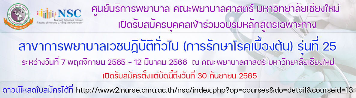 ระหว่างวันที่ 7 พฤศจิกายน 2565 - 10 มีนาคม 2566 ณ คณะพยาบาลศาสตร์ มหาวิทยาลัยเชียงใหม่