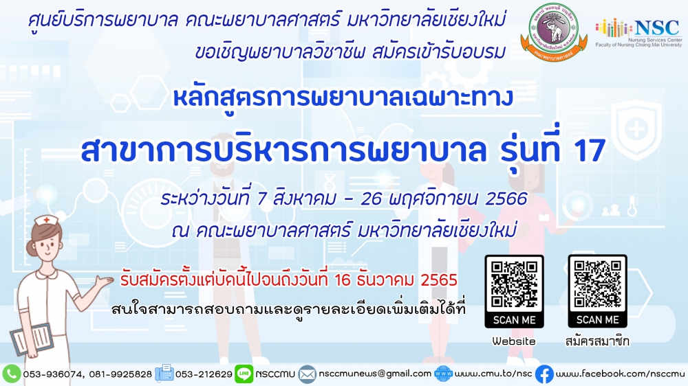 ระหว่างวันที่ 7 สิงหาคม - 26 พฤศจิกายน 2566 ณ คณะพยาบาลศาสตร์ มหาวิทยาลัยเชียงใหม่