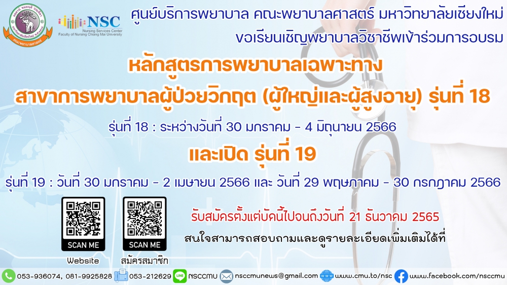 รุ่นที่ 18 : ระหว่างวันที่ 30 มกราคม - 4 มิถุนายน 2566 ณ คณะพยาบาลศาสตร์ มหาวิทยาลัยเชียงใหม่