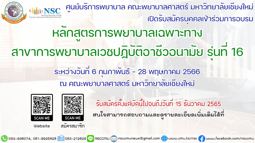 - ทาง Line ID : NSCCMUลงทะเบียน/เบอร์ 081-9925828