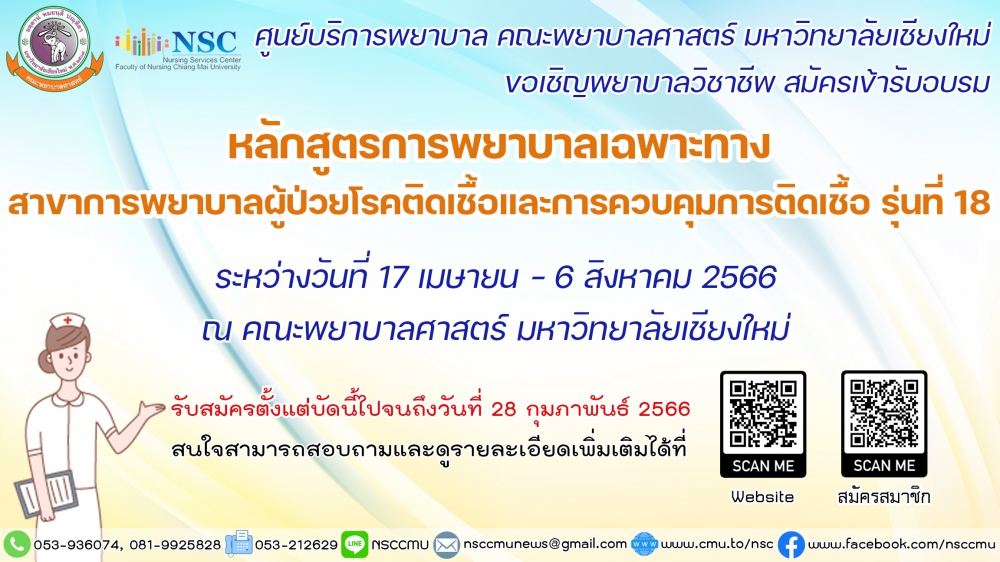 ระหว่างวันที่ 17 เมษายน - 6 สิงหาคม 2566 ณ คณะพยาบาลศาสตร์ มหาวิทยาลัยเชียงใหม่