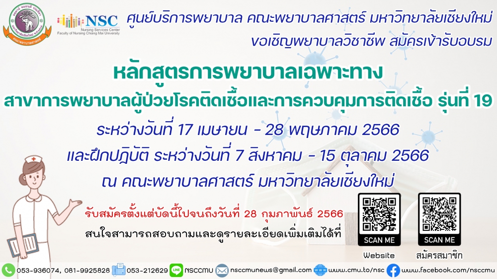 - ทาง Line ID : NSCCMUลงทะเบียน/เบอร์ 081-9925828