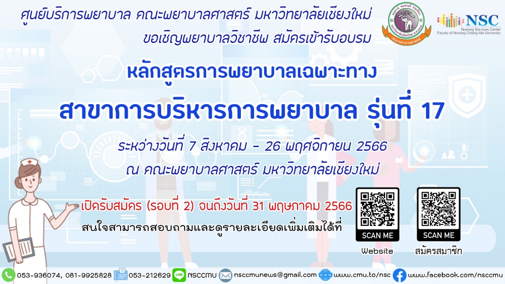 ระหว่างวันที่ 7 สิงหาคม - 26 พฤศจิกายน 2566 ณ คณะพยาบาลศาสตร์ มหาวิทยาลัยเชียงใหม่