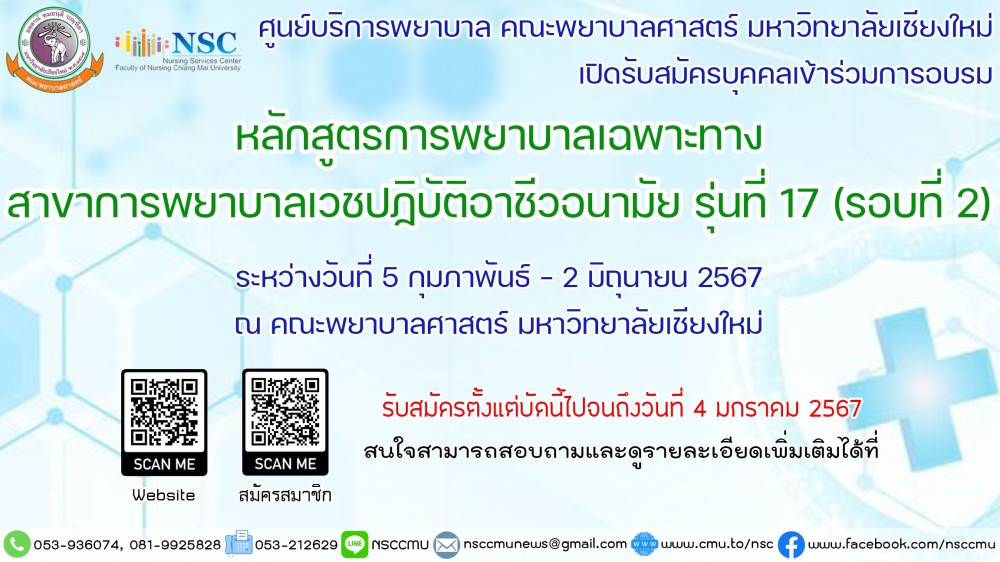 - ทาง Line ID : NSCCMUลงทะเบียน/เบอร์ 081-9925828