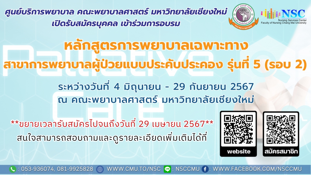 ระหว่างวันที่ 4 มิถุนายน - 29 กันยายน 2567 ณ คณะพยาบาลศาสตร์ มหาวิทยาลัยเชียงใหม่