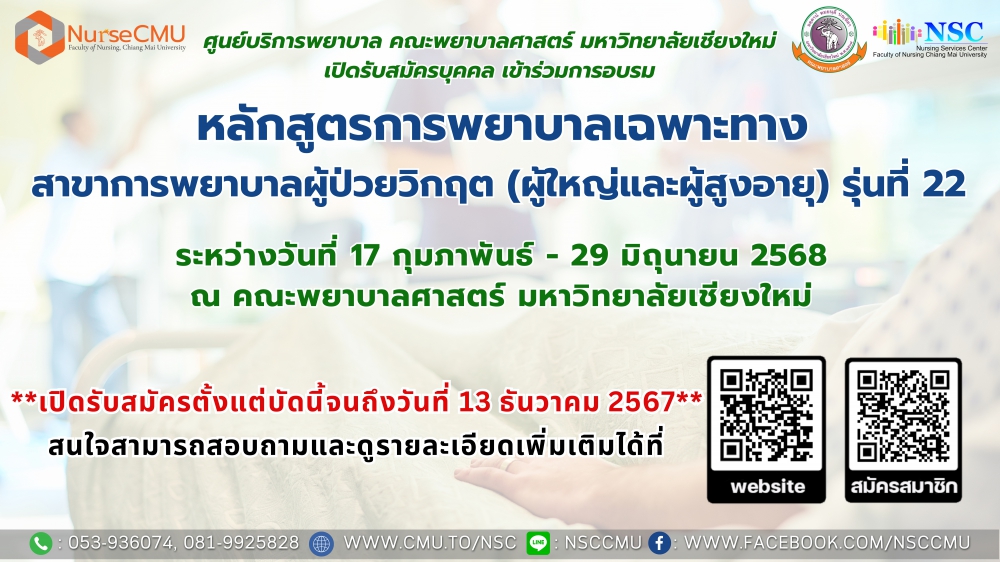 ระหว่างวันที่ 17 กุมภาพันธ์ - 29 มิถุนายน 2568 ณ คณะพยาบาลศาสตร์ มหาวิทยาลัยเชียงใหม่
