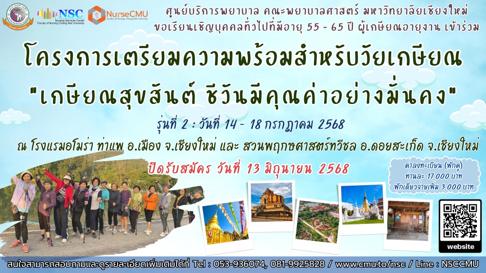 ศูนย์บริการพยาบาล คณะพยาบาลศาสตร์ มหาวิทยาลัยเชียงใหม่ ได้ตระหนักถึงความสำคัญของการเตรียมความพร้อมสำหรับวัยเกษียณ จึงได้จัดโครงการ “เกษียณสุขสันต์ ชีวันมีคุณค่าอย่างมั่นคง”เพื่อมุ่งเน้นการสร้างความพร้อมให้กับประชาชนทุกคน มีการเตรียมความพร้อมวัยเกษียณในด้านสุขภาพ และด้านการดำเนินชีวิตอย่างเป็นสุข ด้านเศรษฐกิจการเงิน กฎหมาย และสิทธิประโยชน์ และคาดหวังว่าผู้เข้ารับการอบรมจะสามารถนำความรู้และประสบการณ์จากการอบรมไปประยุกต์ใช้ในการดำเนินชีวิตอย่างมีคุณภาพและมีความสุขภายหลังเกษียณอายุ