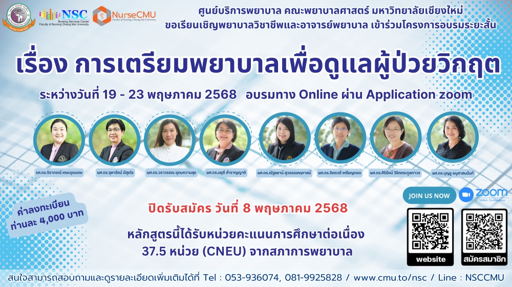 คณะพยาบาลศาสตร์ มหาวิทยาลัยเชียงใหม่ ตระหนักถึงความสำคัญดังกล่าวจึงจัดการอบรมระยะสั้น เรื่องการเตรียมพยาบาลเพื่อดูแลผู้ป่วยวิกฤตสำหรับพยาบาลวิชาชีพ เพื่อให้ผู้เข้าอบรมมีความรู้ความเข้าใจในศาสตร์ของการดูแลผู้ป่วยวิกฤตที่จำเป็น และสามารถนำไปใช้ในการดูแลผู้ป่วยดังกล่าวได้อย่างมีประสิทธิภาพต่อไป
