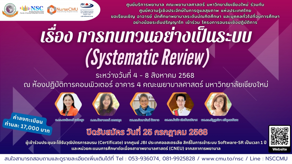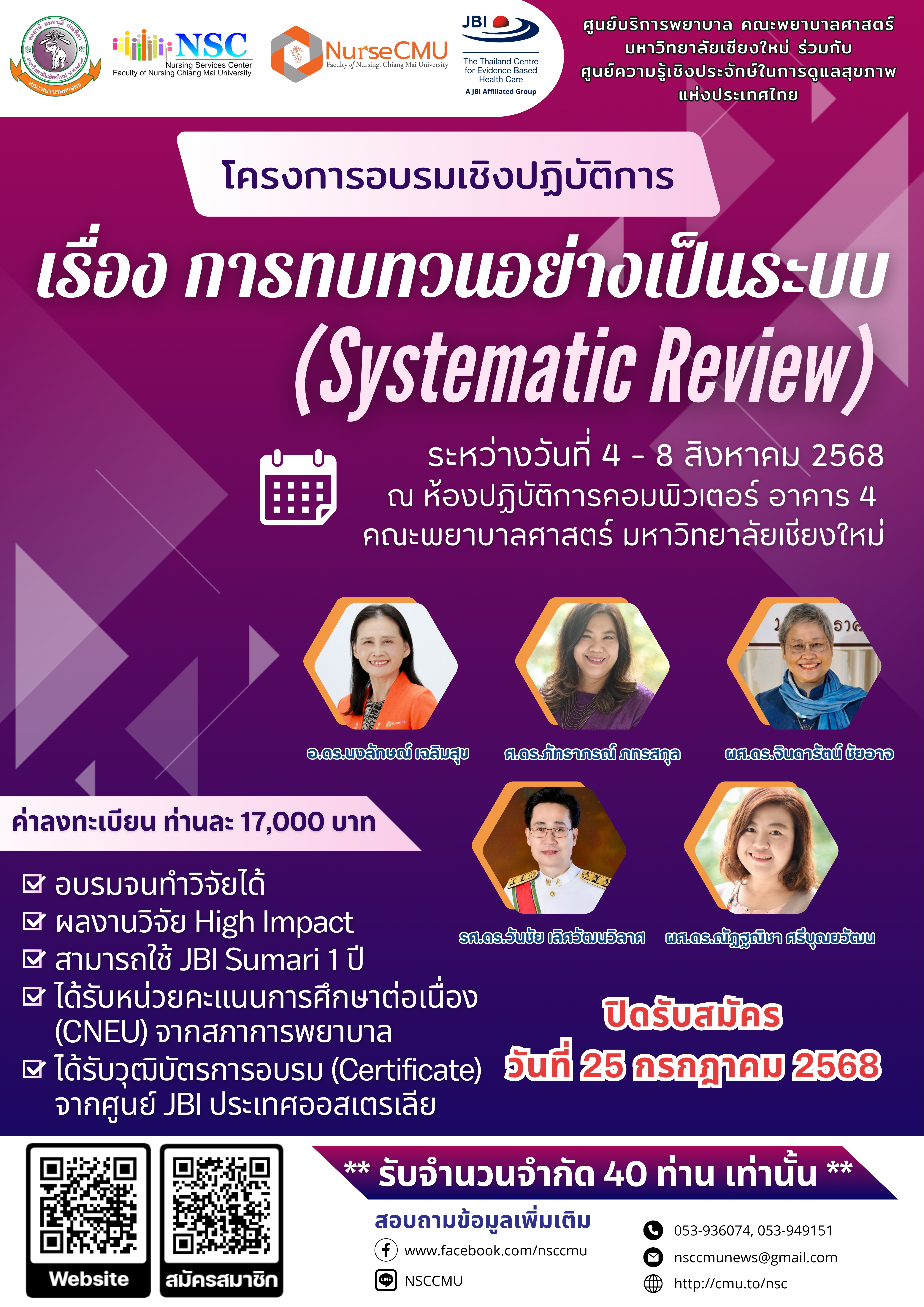 ศูนย์บริการพยาบาล คณะพยาบาลศาสตร์ มหาวิทยาลัยเชียงใหม่ ตระหนักถึงความสำคัญของการพัฒนาองค์ความรู้และทักษะที่จำเป็นสำหรับอาจารย์ นักศึกษาระดับบัณฑิตศึกษา และบุคลากรทางสุขภาพ จึงได้จัดโครงการอบรมเชิงปฏิบัติการ “การทบทวนอย่างเป็นระบบ (Systematic Review)” ในวันที่ 4 ถึง 8 สิงหาคม 2568 เพื่อเพิ่มพูนความรู้และส่งเสริมการจัดการเรียนการสอน การทำวิจัย และการให้บริการด้านสุขภาพที่สอดคล้องกับหลักฐานเชิงประจักษ์อย่างแท้จริง อันจะนำไปสู่การพัฒนาคุณภาพบริการสุขภาพและยกระดับผลลัพธ์ทางสุขภาพของประชาชนได้อย่างยั่งยืนในระยะยาว