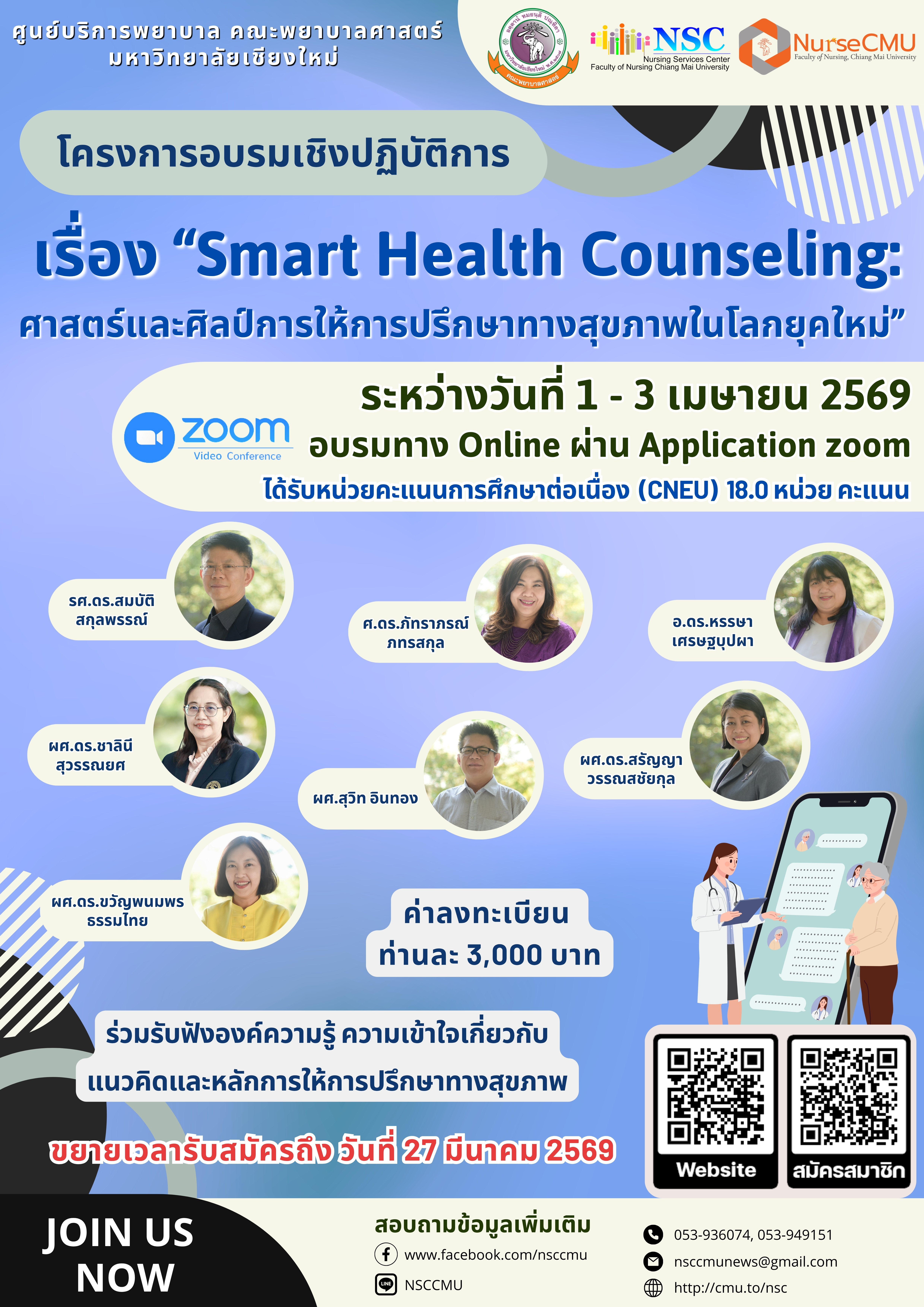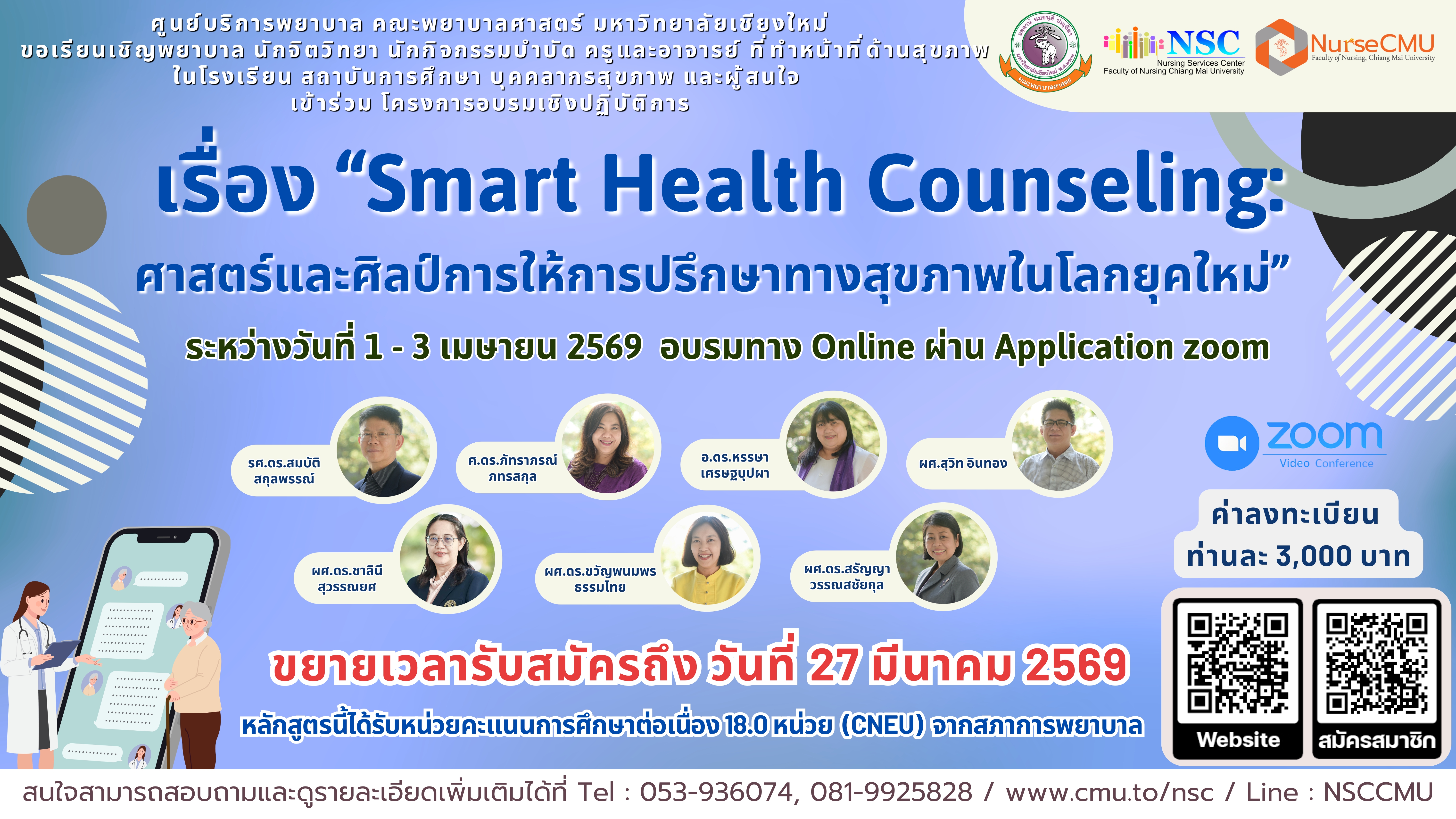 ศูนย์บริการพยาบาล คณะพยาบาลศาสตร์ มหาวิทยาลัยเชียงใหม่ และกลุ่มวิชาการพยาบาลจิตเวช คณะพยาบาลศาสตร์ มหาวิทยาลัยเชียงใหม่ ตระหนักถึงความสำคัญและประโยชน์ของการพัฒนาส่งเสริมศักยภาพของผู้ให้การปรึกษา เพื่อการให้การช่วยเหลือผู้ทุกข์ดังกล่าว จึงได้จัดโครงการอบรมเชิงปฏิบัติการ เรื่อง "Smart Health Counseling: ศาสตร์และศิลป์การให้การปรึกษาทางสุขภาพในโลกยุคใหม่ เพื่อเพิ่มพูนความรู้ความเข้าใจและพัฒนาทักษะสำหรับการให้การปรึกษาทางสุขภาพ รวมทั้งสร้างความตระหนักและเห็นความสำคัญของการให้การปรึกษาทางสุขภาพ เพื่อการให้การช่วยเหลือผู้มีปัญหาทางสุขภาพซึ่งเป็นผู้ทุกข์ที่ไม่เฉพาะผู้มีปัญหาทางกายหรือป่วยด้วยโรคทางกายเท่านั้น แต่ผู้มีปัญหาทางสุขภาพจิต เช่น มีความเครียด ความวิตกกังวลหรือมีภาวะซึมเศร้าจากปัญหาทางสุขภาพกาย ต้องได้รับการส่งเสริมสุขภาพจิต ป้องกันปัญหาทางสุขภาพจิตและโรคทางจิตเวช ก็มีความสำคัญอย่างมาก การให้การปรึกษาทางสุขภาพจะเป็นแนวคิดและแนวทางให้การช่วยเหลือผู้ทุกข์ดังกล่าวได้อย่างดี