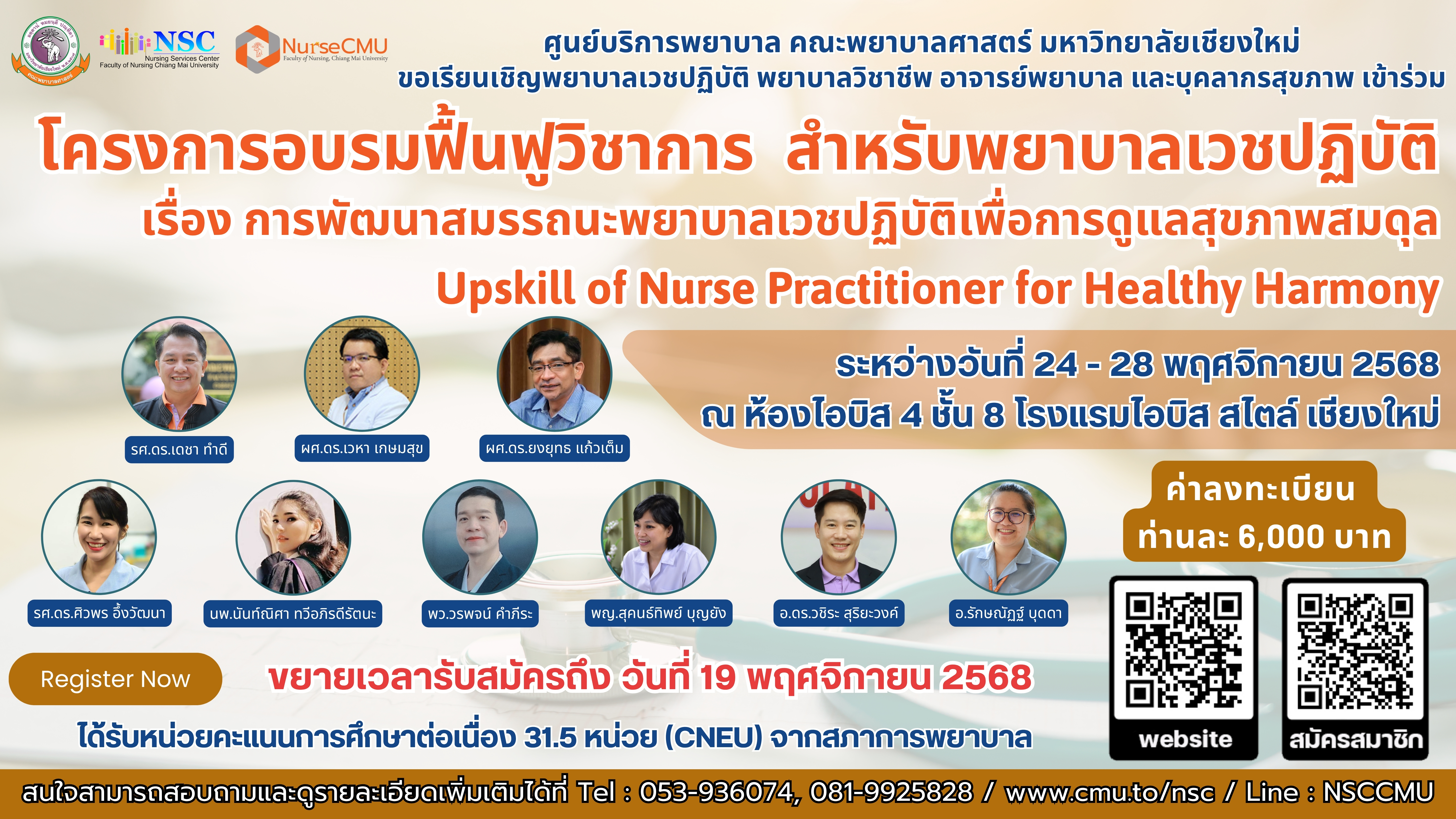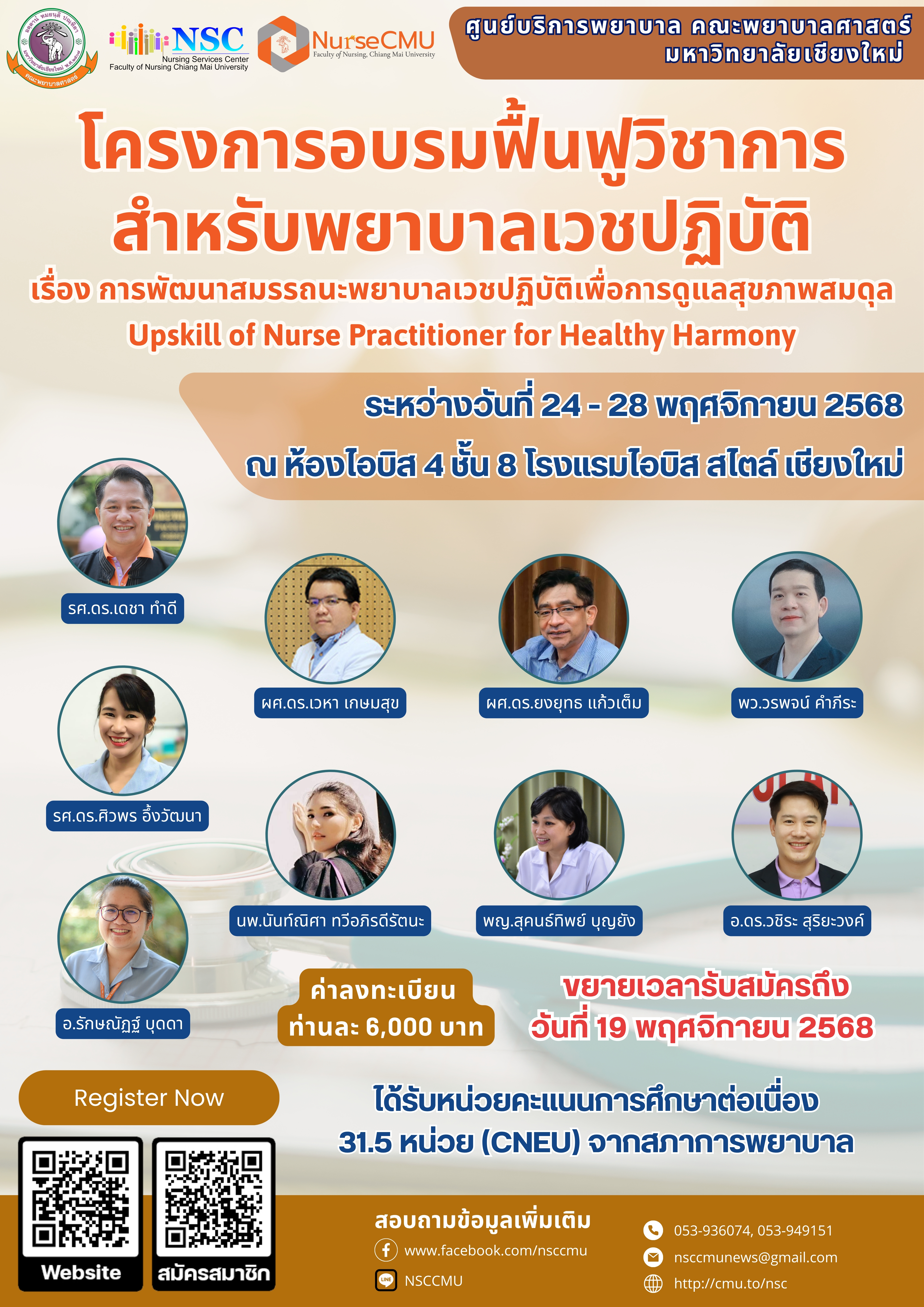 กลุ่มวิชาการพยาบาลสาธารณสุขร่วมกับศูนย์บริการพยาบาล คณะพยาบาลศาสตร์ มหาวิทยาลัยเชียงใหม่ เห็นถึงความสำคัญดังกล่าว จึงจัดโครงการการอบรมฟื้นฟูวิชาการ สำหรับพยาบาลเวชปฏิบัติเรื่อง “การพัฒนาสมรรถนะพยาบาลเวชปฏิบัติเพื่อการดูแลสุขภาพสมดุล : Upskill of Nurse Practitioner for Healthy Harmony” เพื่อเพิ่มพูนความรู้ทักษะสมรรถนะและประสบการณ์แก่พยาบาลเวชปฏิบัติทั่วไปให้ถูกต้องและทันสมัยในการบริการยุคใหม่ซึ่งจะส่งผลให้เกิดคุณภาพในการดูแลผู้ป่วยและประชาชนอย่างมีประสิทธิภาพต่อไป